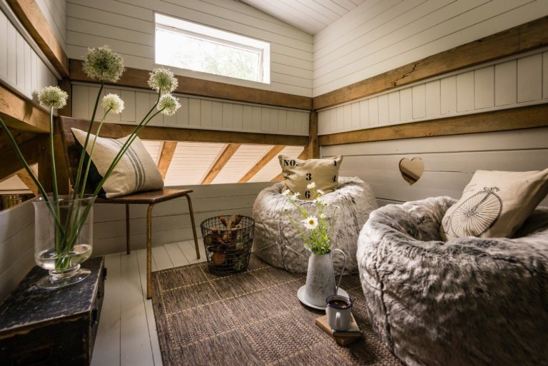 Každá část chaty je opticky oddělená, avšak navržená šikovně tak, že na sebe jednotlivé obytné plochy přirozeně navazují a spojují se i s okolní přírodou. Z ložnice je možné rovnou vstoupit do zahrady a okoupat se v lázni. Manželská postel je povlečena jemným přírodním plátnem a umělými kožešinami, aby bylo dosaženo opravdového zážitku ,,z volné přírody". Koupelna je vybavena sprchovým koutem, toaletou a vyhřívaným věšákem na ručníky. Tento nápad jistě ocení všechny zimomřivé duše. Přestože je tento luxusní úkryt ponořen do starých lesů, ti, kterým se zasteskne po trošce společnosti mohou navštívit místní hostinec, nacházející se nedaleko odtud, nabízející tradiční anglickou kuchyni. Vychutnat si snídani na terase, slyšet zpěv ptáků, šum listí stromů a v noci pozorovat mléčkou dráhu. No není tohle ráj?