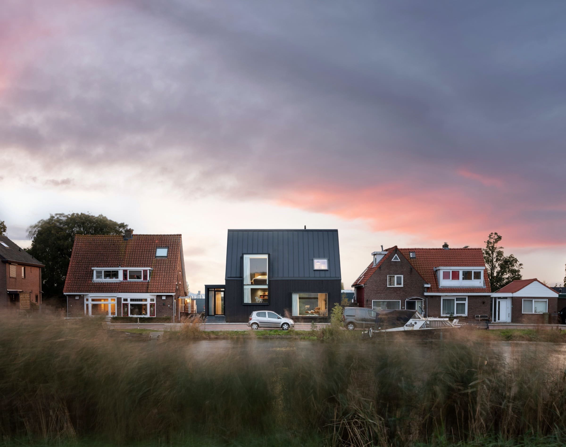 V nizozemské vesnici Lijnden, 10 km od Amsterdamu, je přehrada. Přímo na nábřeží, které udržuje vodu pod kontrolou, se nachází dům, který je celý černý a úhledný. Dynamika, jednoduchost: to jsou vlastnosti projektu, který nese podpis kanceláře Arjen Reas Architects, místního studia, které se postavilo výzvě výstavby rodinného domu na nerovném terénu, se specifickými požadavky charakterizovaných výrazným rozdílem v nadmořské výšce. Tvar budovy, členěný na dvou podlažích, se přizpůsobuje svahu a odráží ho silně šikmá střecha.