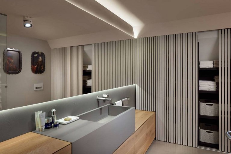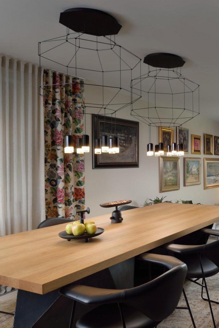 Kapitola sama pro sebe jsou světla. U vchodu jsme uvítáni řadou stropních světlometů You-Turn. Tatáž světla lze najít v kuchyni a koupelnách. V obývacím pokoji je nepostradatelný doplňkem lustr Heracleum Big O od nizozemského výrobce Moooi. Osvětlení, které nelze přehlédnout je úžasná stojací lampa Farooo, která stojí v ložnici pro hosty.