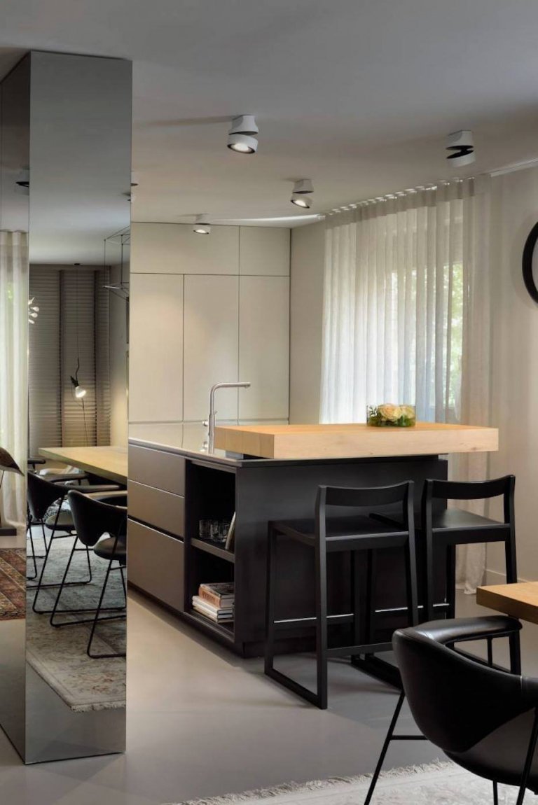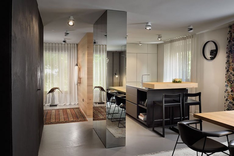 Renovace pokračovala přehodnocením půdorysu a výběrem nábytku. První byla nová kuchyň ve dvou odstínech šedé, zjemněná dřevěnou stěnou. Architekti přeměnili původní nosný sloup na zvláštní, téměř barokní výzdobu: pomocí zrcadel vytvořili spojovací prvek místo klasické přepážky, protože zrcadlo zachycuje odrazy z haly, ze zahrady, ze schodiště.