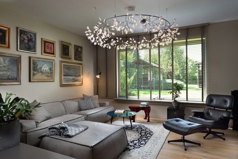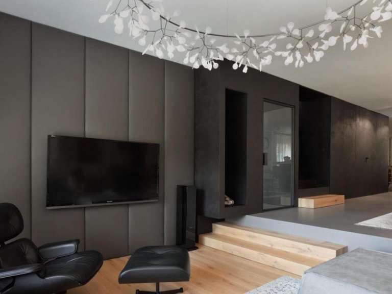 Po dvou krocích sestoupíme do obývacího pokoje, který s nábytkem a výběrem dekorace připomíná útulný staroměstský salon. Pokud byste si museli vybrat slovo, které nejlépe vystihuje pocit v obývacím pokoji, byla by to jemnost: měkká pohovka je doplněna klasickým designem, křeslo Eames Lounge s opěrkou pro nohy, měkký lustr (podle architektů se skládá až z 324 LED světel), teplé parkety a perský koberec. Naproti pohovce je kožená stěna s audiovizuálním rohem. K bohatému charakteru interiéru a rodinnému dědictví přispívá také olej na plátně.