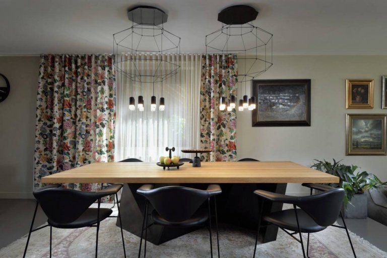 Začněme od začátku: nový stůl s masivní dřevěnou deskou na impozantní kovové základně byla láska na první pohled. Architekti stůl skvěle doplnili dvojicí lustrů a kovovými židlemi s koženým sedákem. Celá tato kompozice byla umístěna na perský koberec - rodinné dědictví. A tak původní jídelna zcela změnila svůj ráz a již přestala odpovídat zastaralému interiéru. Touha po větším a příjemnějším jídelním stole vyvolala skutečný dominový efekt. Architektka Tanja Span Vasiljevic z Archimetrics Bureau říká: „Dům byl postaven v roce 1986. Bez stavebních prací jsme chtěli co nejlépe využít prostor a vytvořit interiér, který je pohodlný, užitečný a kvalitní. Neformální luxus plný teplých a mírně tmavých tónů a neobvyklých vybraných kusů nábytku odráží rozhodující charakter klienta.“