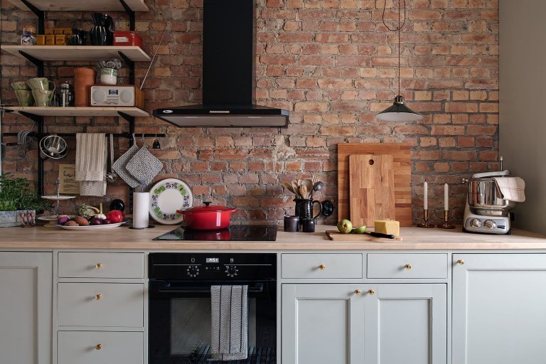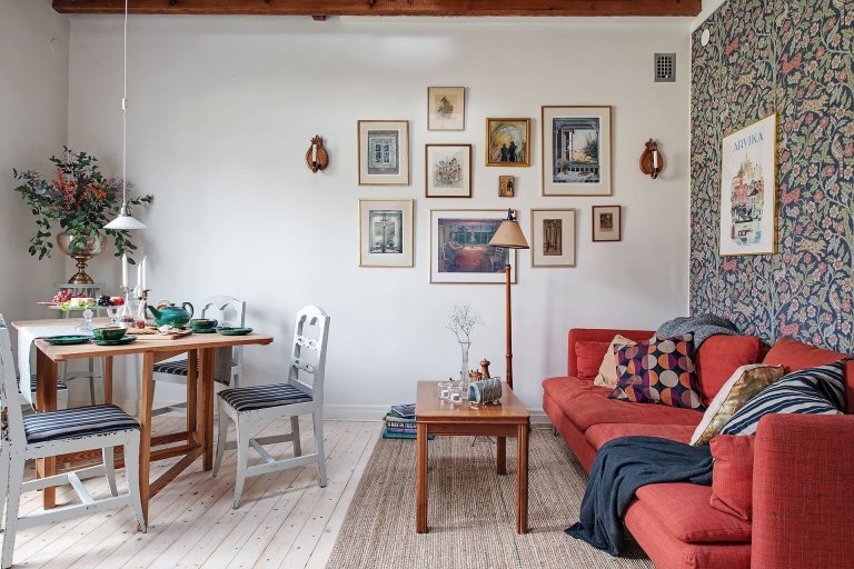 Tento dvoupodlažní byt není tak velký, jak podle fotek vypadá, ale i přesto poskytuje majitelům dost prostoru. Skládá se z kuchyně, jídelny, obývacího pokoje a ložnice. Opticky mu na velikosti přidávají velká okna se spoustou denního světla. Tapeta a červená pohovka v obývacím pokoji jsou bezpochyby hvězdami této části interiéru. Tento byt je skvělým příkladem toho, jak si interiéry ve starých budovách mohou zachovat své staromódní kouzlo. Majitelé na konci kuchyně nainstalovali velkou skříň a vyhýbali se zavěšení kuchyňských skříněk, aby cihlová zeď nebyla ničím zastavěna a rušena. V celém bytě je patrný rukopis majitelů, kteří rádi kombinují staré s novým: cihlové zdi, květinové tapety, dřevěné obklady natřené bílou, stejně jako nábytek, ve kterém se střídá moderní nábytek a spotřebiče, jako je tomu u nové šedé kuchyně a starého recyklovaného nábytku, jako je skříň, která byla původně bílá nebo stůl, který byl upraven stejným způsobem.