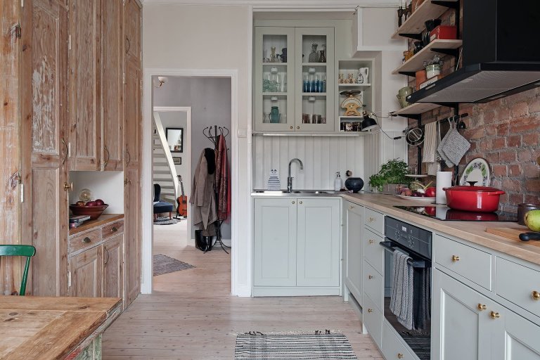 V celém prostoru najdete originální detaily, jako jsou odkryté cihlové zdi, původní dřevěné podlahy a odkryté trámy. Spolu s vintage nábytkem je tento domov skutečně útulný a krásný. Především s důrazem na odhalené trámy. Design tohoto bytu v rezidenční čtvrti v Göteborgu by se ideálně hodil do interiéru malého rustikálního statku. V prvním patře je schodiště do ložnice a malé domácí kanceláře, stejně jako ve skandinávských domech. Jen nábytek a zajímavé starožitné předměty dávají bytu dobrou domácí atmosféru a jedinečnost.