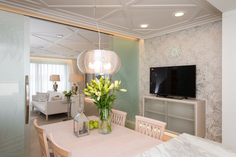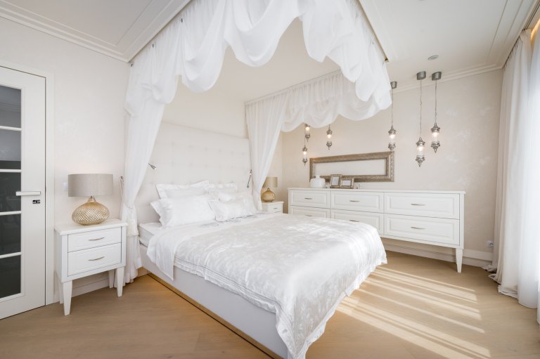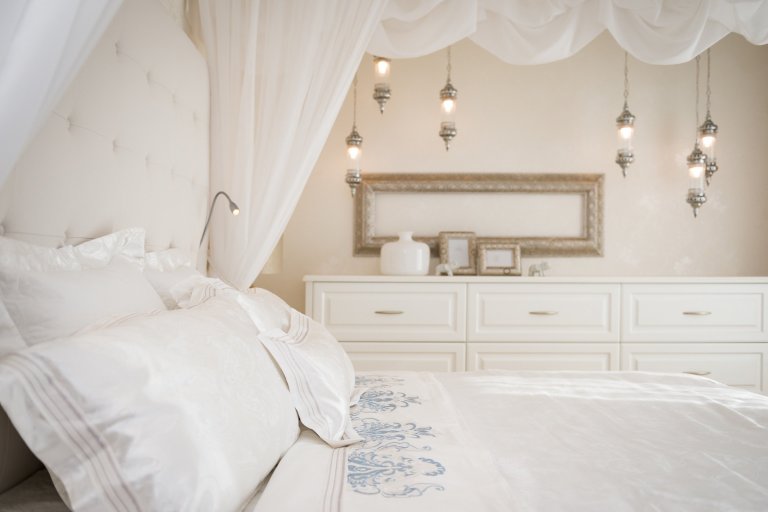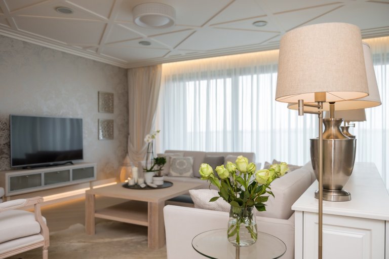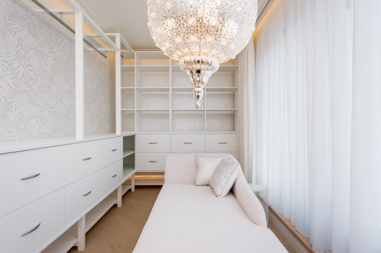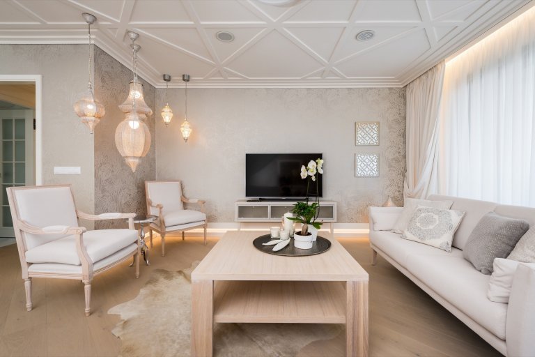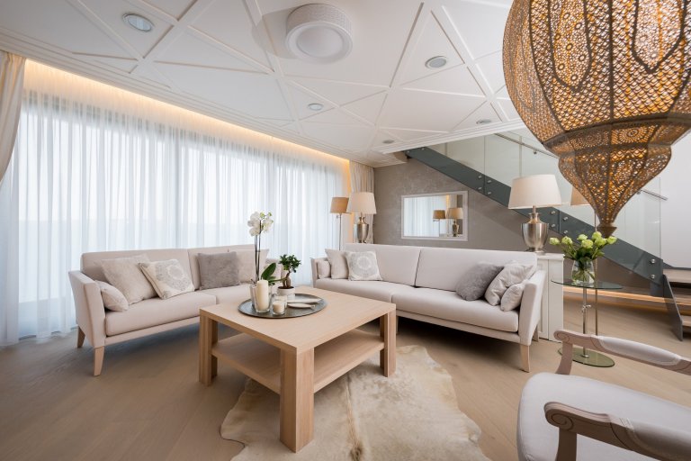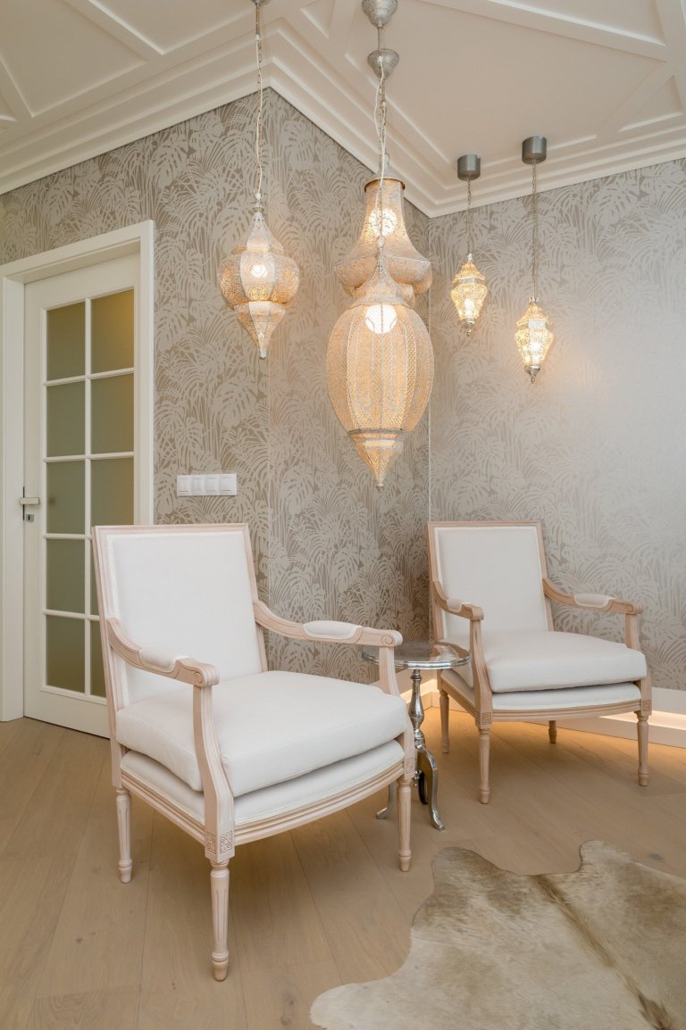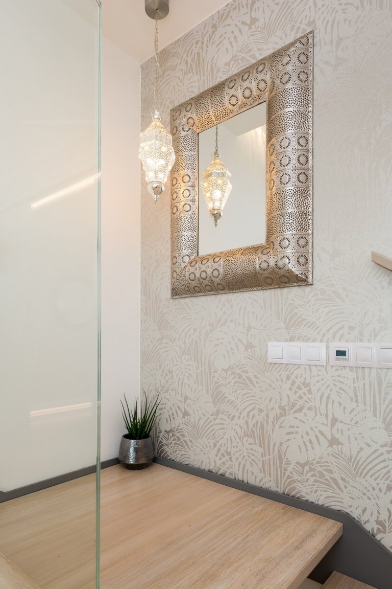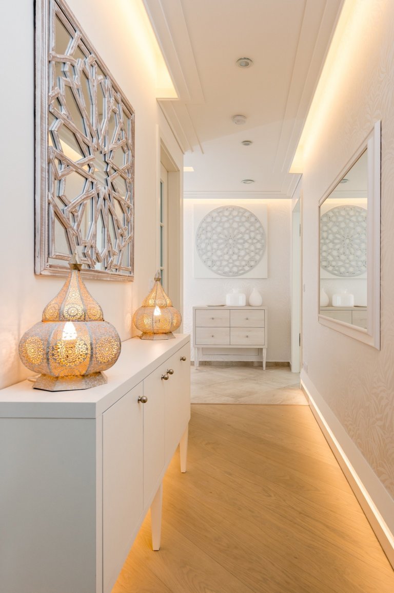 Světlé odstíny, luxusní vybavení a zástup svítidel – to jsou hlavní zkrášlující prvky tohoto interiéru. Rukopis autorky je však patrný především v doplňcích, které do prostoru vnášejí tolik přitažlivý nádech Blízkého východu. Čtrnáct let prožitých v Libanonu se zkrátka odrazilo i v práci designérky, která svou lásku ke zdobnosti Orientu naplno projevila také v bytě jako stvořeném pro spisovatele. Na první pohled tak zaujmou kazetové stropy s ozdobnými lištami připomínající tradiční blízkovýchodní architekturu, závěsné i stojící orientální lucerny dovezené přímo z Dubaje, honosné závěsy splývající až na zem či velká zrcadla s ozdobnými rámy. Kouzlo Orientu a romantiky se přitom nejpřitažlivěji snoubí v naprosto luxusně zařízené ložnici, jíž vévodí doslova pohádková postel s nebesy podsvícená tak, aby vypadala, že se vznáší. Dotek exotiky je rovněž patrný na některých kusech na míru navrženého nábytku, ať už se jedná například o bar s lampami v obývacím pokoji umístěný za sedací soupravou.