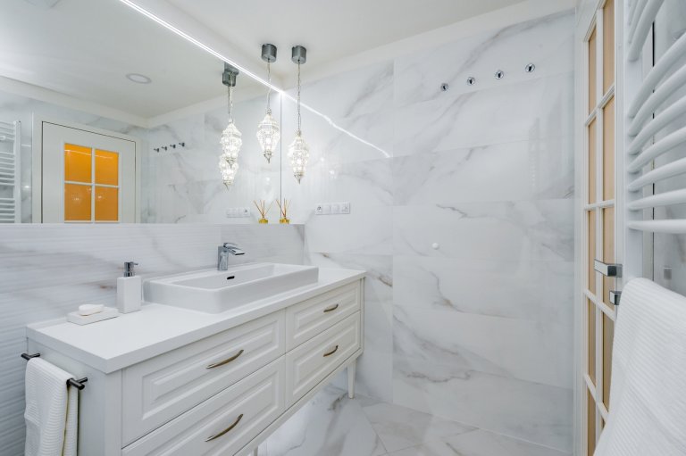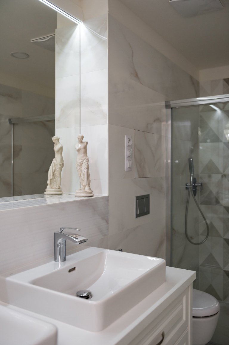 Interiér pražského bytu je útulný, reprezentativní i plně funkční. Na přání majitele působí ve výsledku také lehounce a něžně. Je nápaditý, neotřelý a jako stvořený pro čerpání inspirace k tvůrčí práci. K tomuto účelu slouží zejména pracovna, která je zařízena nejstřídměji, aby zaručila naprostou koncentrovanost. To však nic nemění na faktu, že působí podobně luxusně jako zbytek interiéru. Nenápadný luxus vládne také v kuchyni, ve které zaujme především mramorová pracovní deska či elegantní bílá digestoř se světly. Stejný styl jako kuchyňský nábytek představuje i ten koupelnový, také zde se objevuje využití mramoru. Luxusně, nejen co se prostoru týče, působí rovněž šatna doplněná o divan, jež slouží k pohodlnému převlékání. Všechny místnosti mají stylový, jemný a přitažlivě romantický nádech. stylově, Navíc přicházejí s funkčností a opravdu kvalitními materiály.
