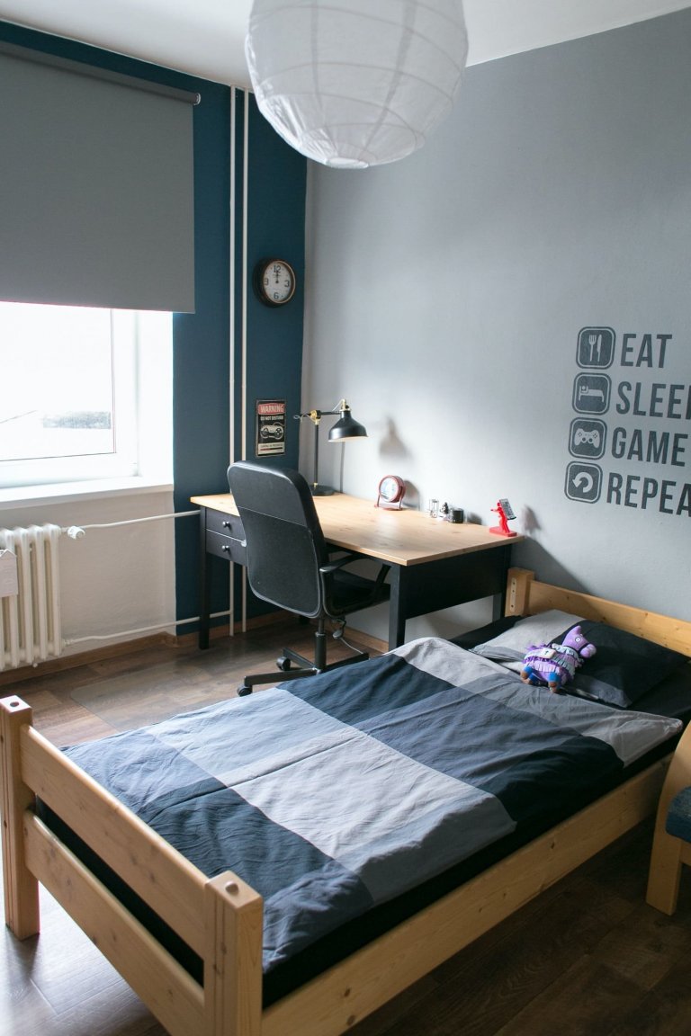 Co se týče materiálů použitých v bytě, podlahu zdobí pěkné i praktické francouzské linoleum s autentickým vzorem prken. A pokud jde o barvy, dali manželé přednost kombinaci bílé s přírodními zemitými tóny. Výjimkou je barevná paleta v dětských pokojích, v nichž vedle bílé barvy dostala prostor také šedá a tmavě modrá. Díky takové barevné kombinaci totiž mohlo vzniknout pořádně tajemné klučičí doupě.