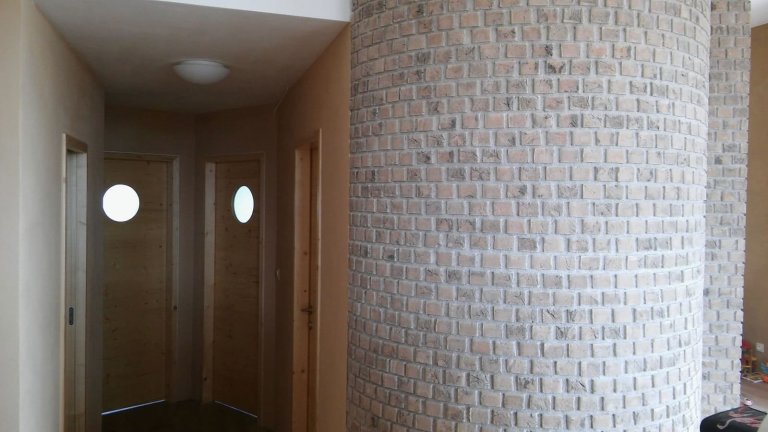 V severní části domu jsou situovány dvě nevytápěné místnosti, které suplují zahradní domek a sklep. Nachází se zde místo pro kola, zahradní náčiní a také spíž. V zahradě tak není třeba nic více budovat. Co se týče dětských pokojů, ty jsou zatím propojeny do jednoho. V budoucnu však bude možné rozdělit je pomocí příčky. Uvažuje se také o jurtě pro děti, která by časem vyrostla v zahradě. Součástí bydlení je v rámci obývacího pokoje také pracovna a vyvýšené patro s pokojem pro hosty. V domě se nachází pouze jedna koupelna a toaleta. Majitele domu dodnes překvapuje, jak dobře a do detailu je jejich nové bydlení promyšlené. Praktické a estetické detaily domu si uvědomují každý den, ať už se jedná o řešení oken či umístění dřeva do krbu. Tím, co zde však zaujme na první pohled, je oblá stěna v centru dispozice, která ukrývá technickou místnost s velkou akumulační nádrží. Byla vyzděna z odpadových cihel vzniklých při výrobě cihlových pásek, čemuž také odpovídá nízká pořizovací cena.