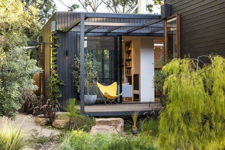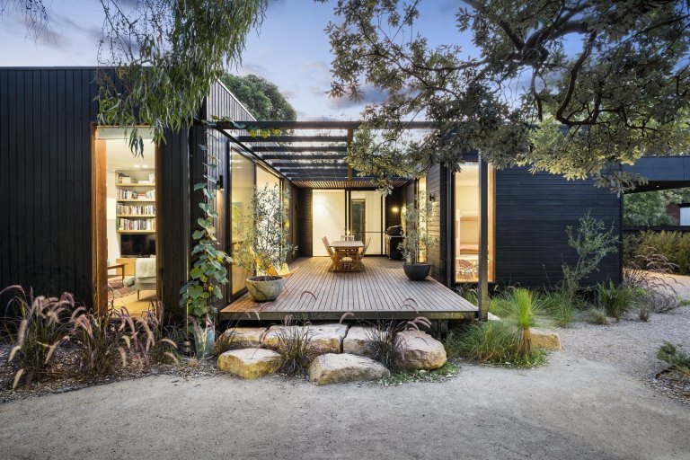 Dům obložený dřevem v tmavém nátěru se rozkládá na prostorném pozemku s rozlehlou zahradou s převahou rozměrných kamenů a nenáročných travin typických pro toto australské přírodní prostředí. Před domem je zastřešené garážové stání tvořené vysunutým pilířem ve stejném barevném tónu jako zbytek domu. Přízemní stavba tvořená jednotlivými moduly v nich zahrnuje tři ložnice, dětskou hernu a otevřený obytný prostor, což je vzhledem k tomu, že se jedná pouze o rekreační obydlí, dostatečné i pro celoroční pobyt.