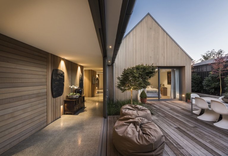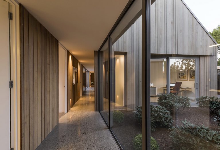 Architekt chtěl, aby tato nemovitost byla městským pojetím typického anglického statku se sedlovou střechou, takže každé části dal sedlový profil. Jsou uspořádány ve tvaru U a jsou propojeny prosklenou chodbou. Dům je plný všech druhů současných moderních prvků uvnitř i venku. Stávající velké posuvné dveře umožňující snadný přístup do venkovního obývacího prostoru, udržovaná zahrada, rustikální obývací pokoj, i ložnice dávají domu na útulnosti. Díky otevřeným prostorům a posuvným proskleným dveřím tak všechny jednotlivé budovy těží z bohatého přirozeného světla. Dřevěné obklady přinášejí domů bezkonkurenční pocitové teplo. Okna i arkýře otevírají interiér do venkovního obývacího prostoru, který je také pokryt dřevem.