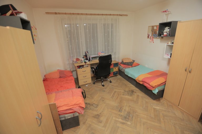 Ve stejném duchu se nesla i rekonstrukce kuchyně. K propojení místnostní bylo na podlahu použito marmoleum v limetkové zelené barvě. Krytina v dětském pokoji je ze sametového vinylu. Výhodou je dobře omyvatelný povrch příjemný na dotek. Adélka si oblíbila šedou barvu, proto je pokoj laděn v těchto odstínech a je doplněn o hořčicově žluté prvky. Kvůli malému prostoru je postel pro dceru vyšší, aby se pod ní se vešly úložné skříně. Zároveň je v pokoji rozkládací pohovka s velkou ložnou plochou.