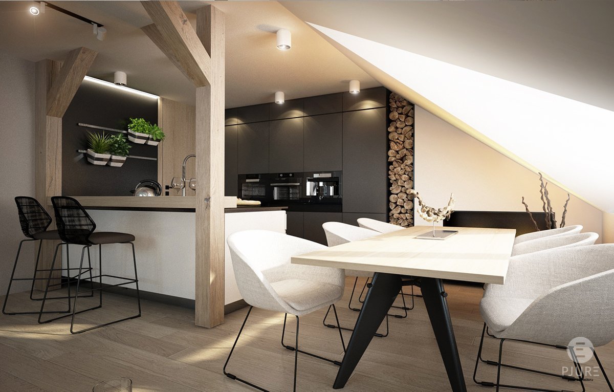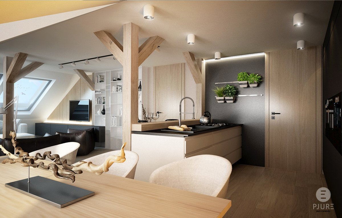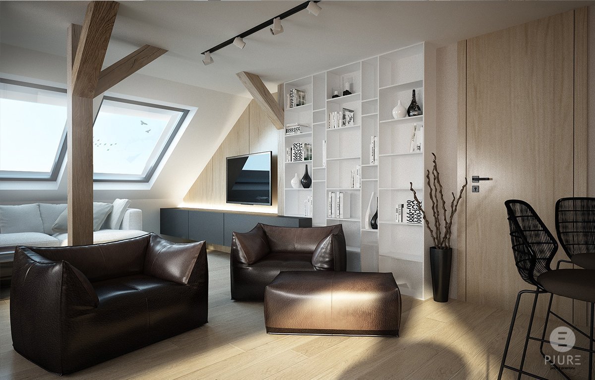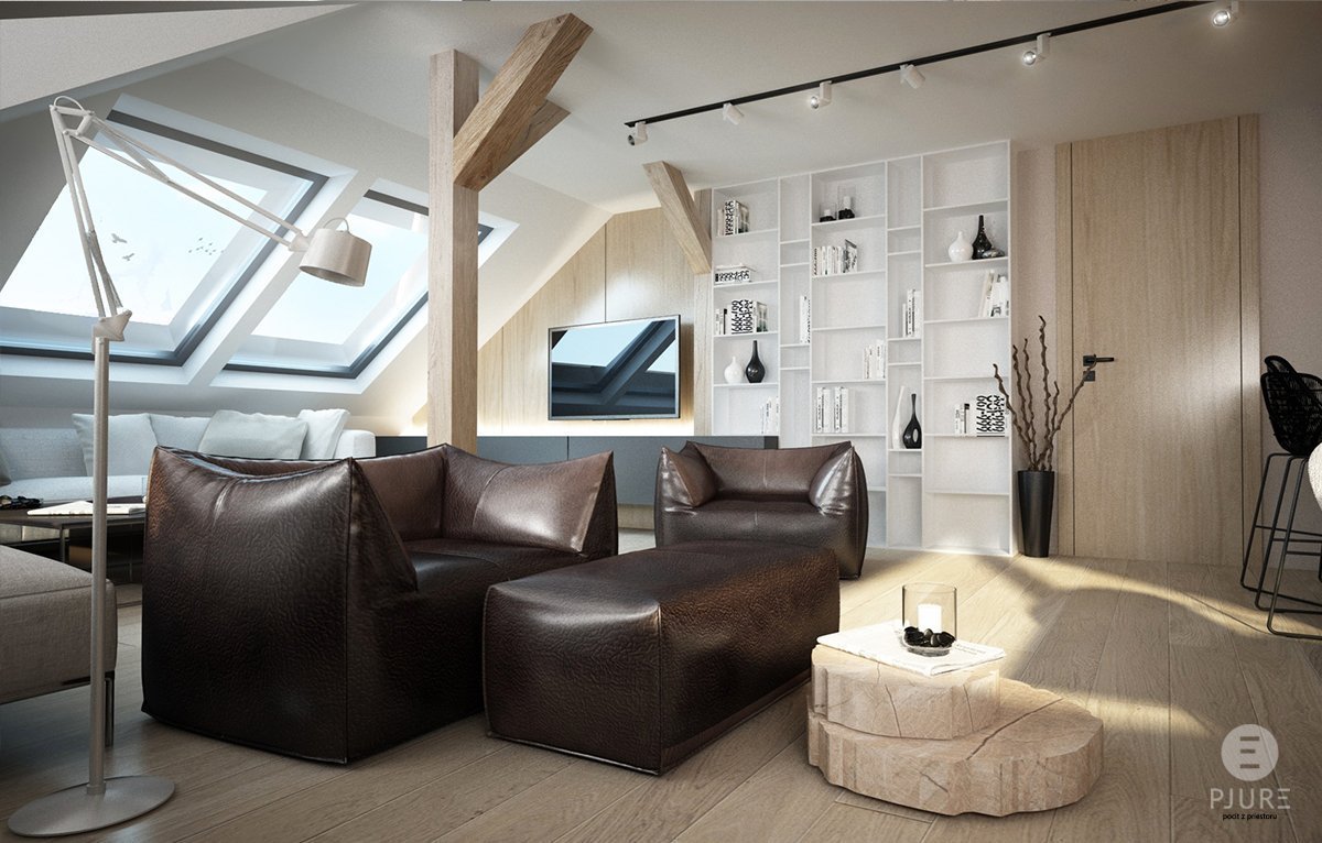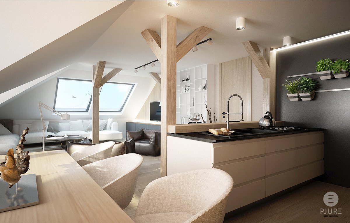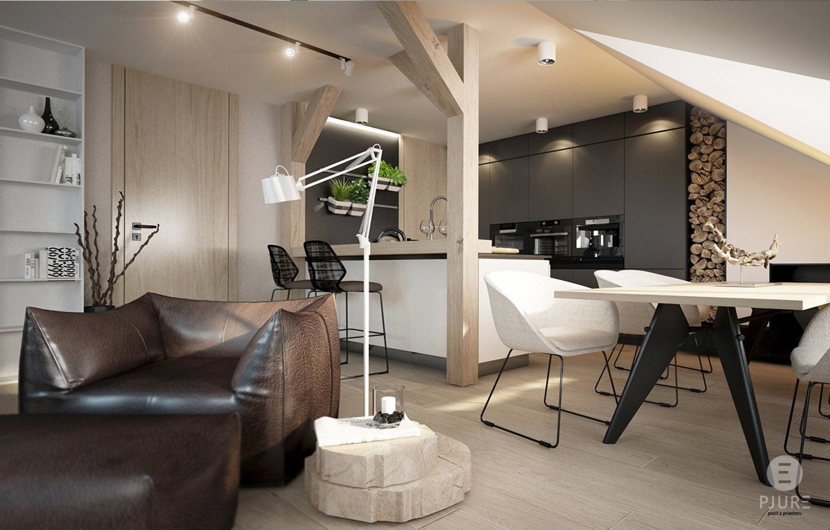 Půdní prostory mají svou přirozenou atmosféru, která se dá podtrhnout dobrým řešením. V tomto prostoru navrhli architekti studia PJURE obývací pokoj propojený s kuchyní.