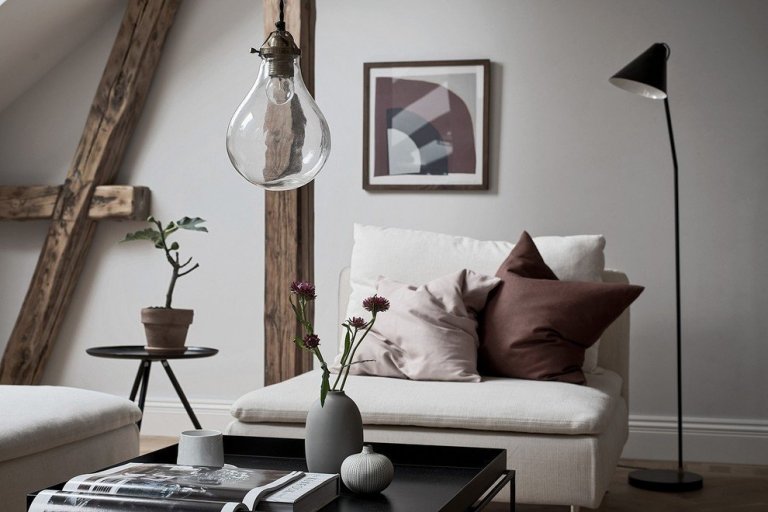 Interiér bytu je typicky skandinávský, a to nejen z hlediska barev, tvarů ale také díky celkovému dojmu. Jsou zde světlé pohovky, tenký, jemný konferenční stolek s geometrickým tvarem a moderní, téměř puristické, osvětlení, tvořené jedinou žárovkou visící nad stolem v obývacím pokoji. Světlým prostorem proudí světlo střešními okny i malými okénky u podlahy. Místnost rozveselují zelené rostliny v květináčích.