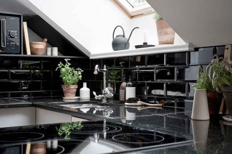 V kuchyni najdeme pracovní desku z kamene, která spolu s černým obkladem působí velmi luxusně. Stylová retro baterie i retro doplňky hrají zajímavou podívanou. Tmavé dlaždice zde, díky dostatečnému světlu ze střešního okna, nepůsobí vůbec depresivně, ba naopak.