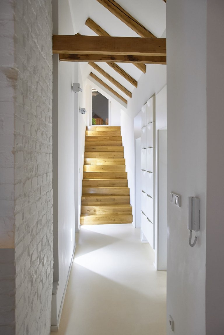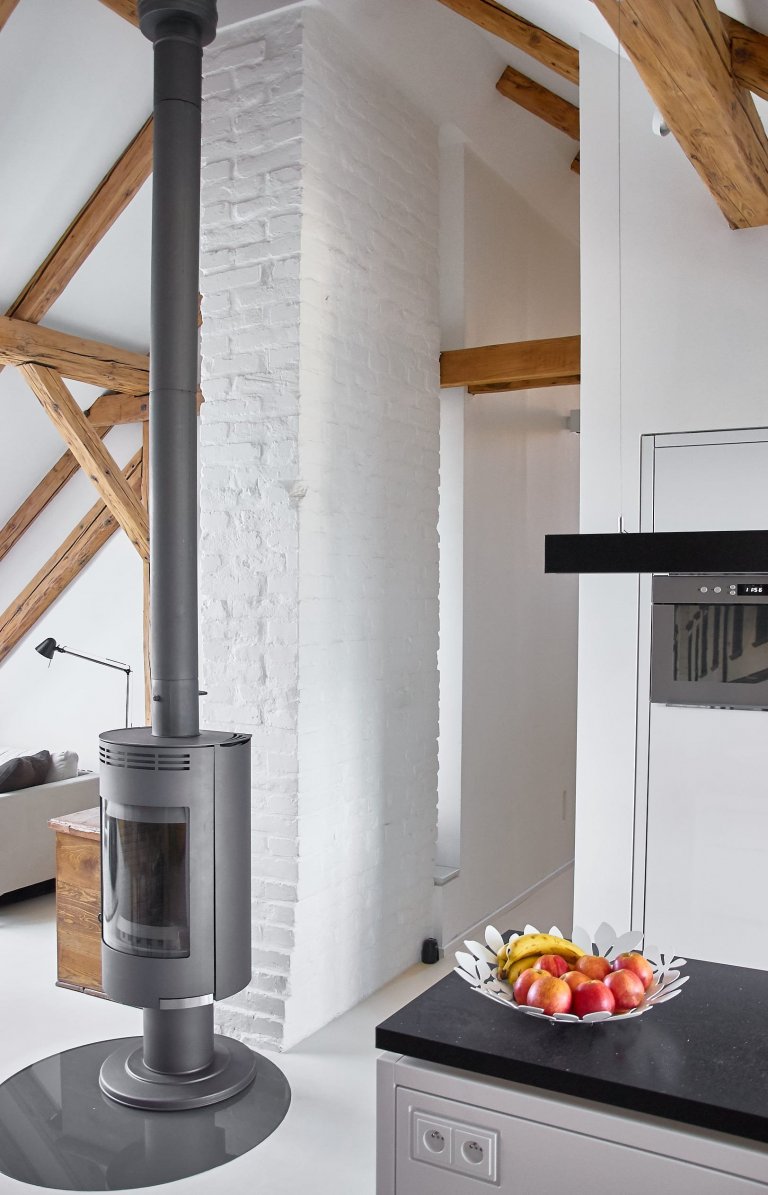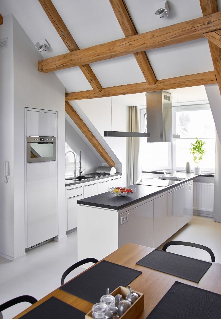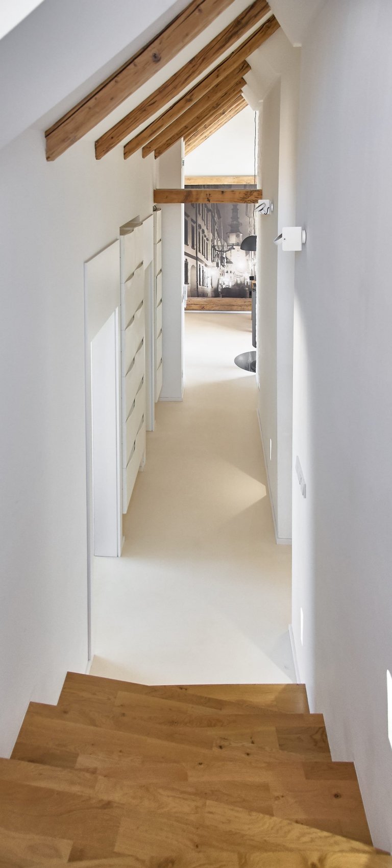 Podkrovní byt pro čtyřčlennou rodinu s otevřeným prostorem na celou výšku. Přiznaný krov je a prezentován na neutrálním bílém pozadí nových konstrukcí. Nad vstupem do bytu byla vytvořena střešní terasa s výhledem na město.
