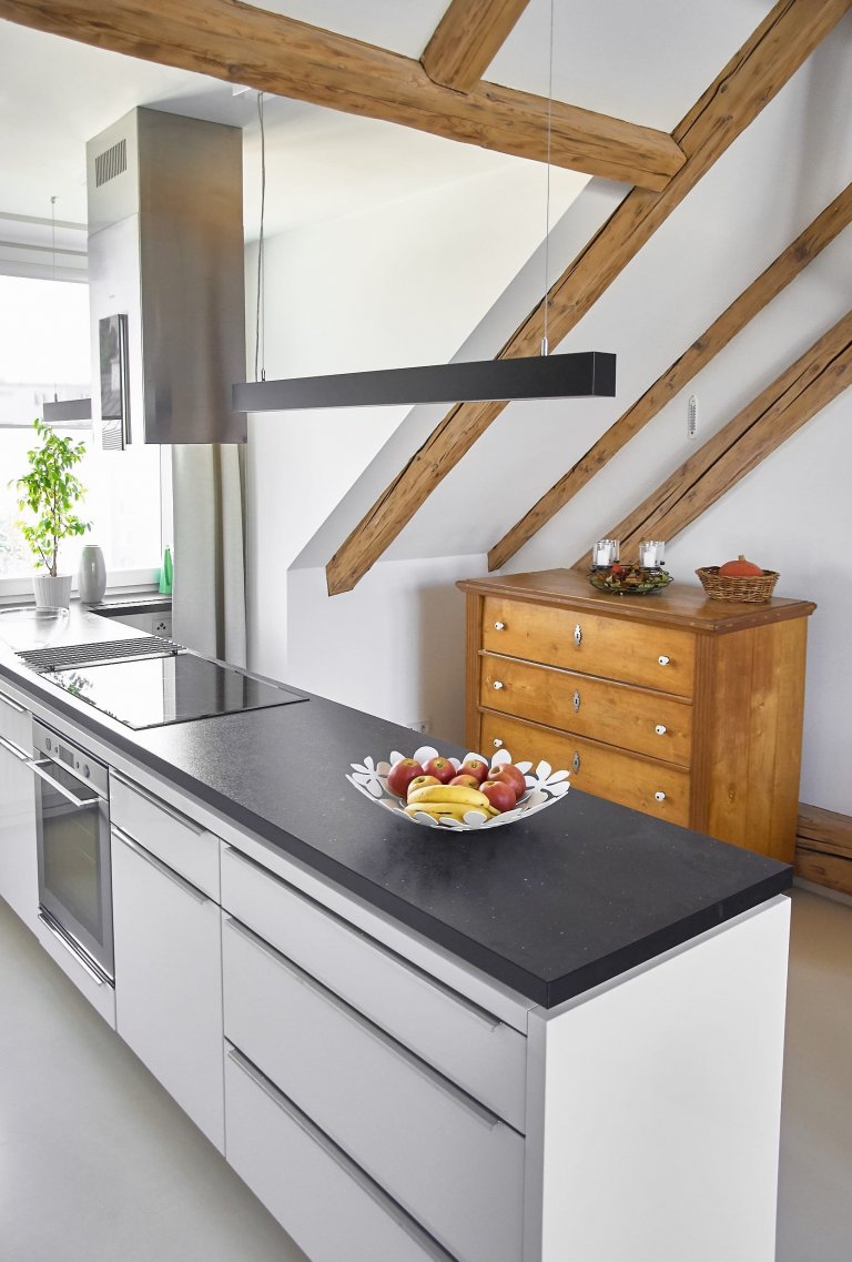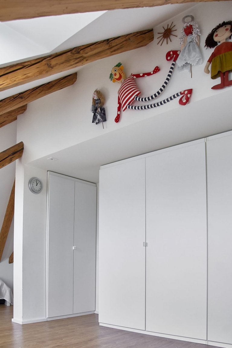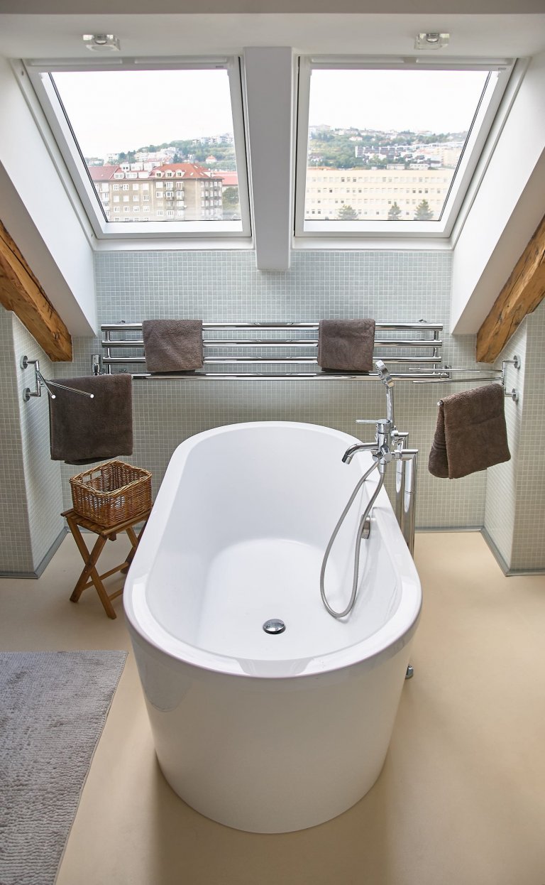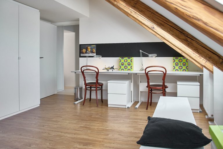 Podkrovní byt pro čtyřčlennou rodinu s otevřeným prostorem na celou výšku. Přiznaný krov je a prezentován na neutrálním bílém pozadí nových konstrukcí. Nad vstupem do bytu byla vytvořena střešní terasa s výhledem na město.