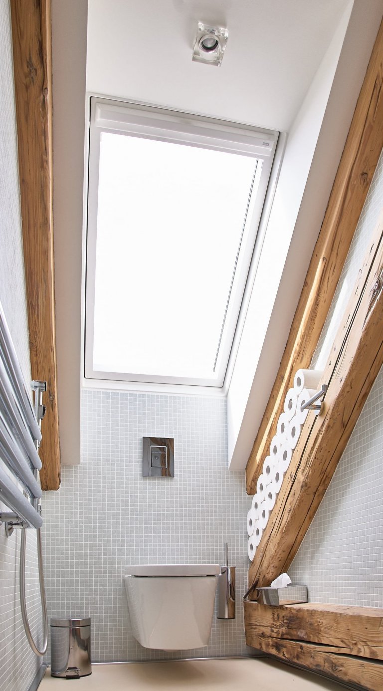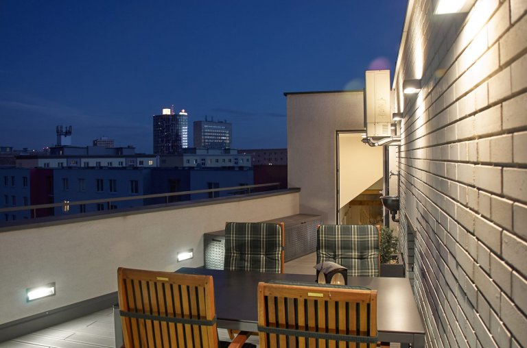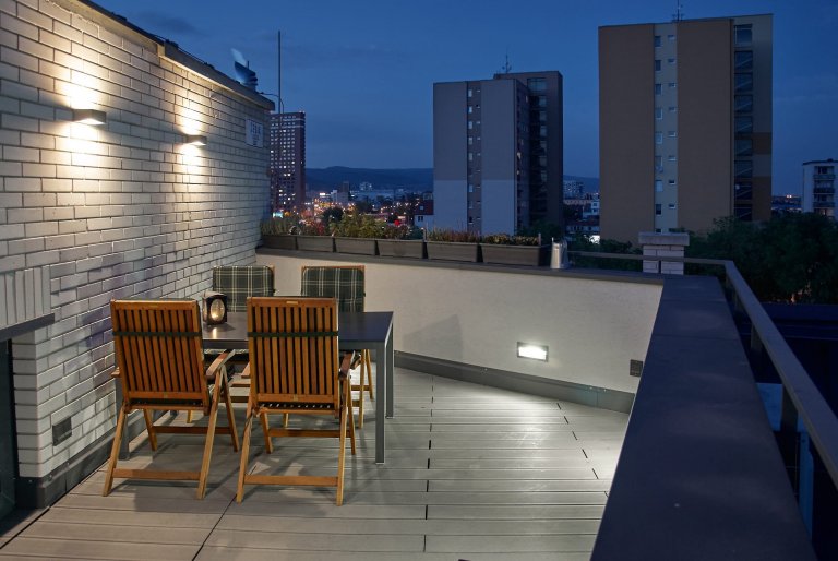 Část šikmé střechy nad vstupem do bytu byla nahrazena střešní terasou přístupnou mlýnské schody z chodby. Vložení mezistropu v části dětského pokoje umožnilo vytvořit pro střešní terasu malý sklad.
