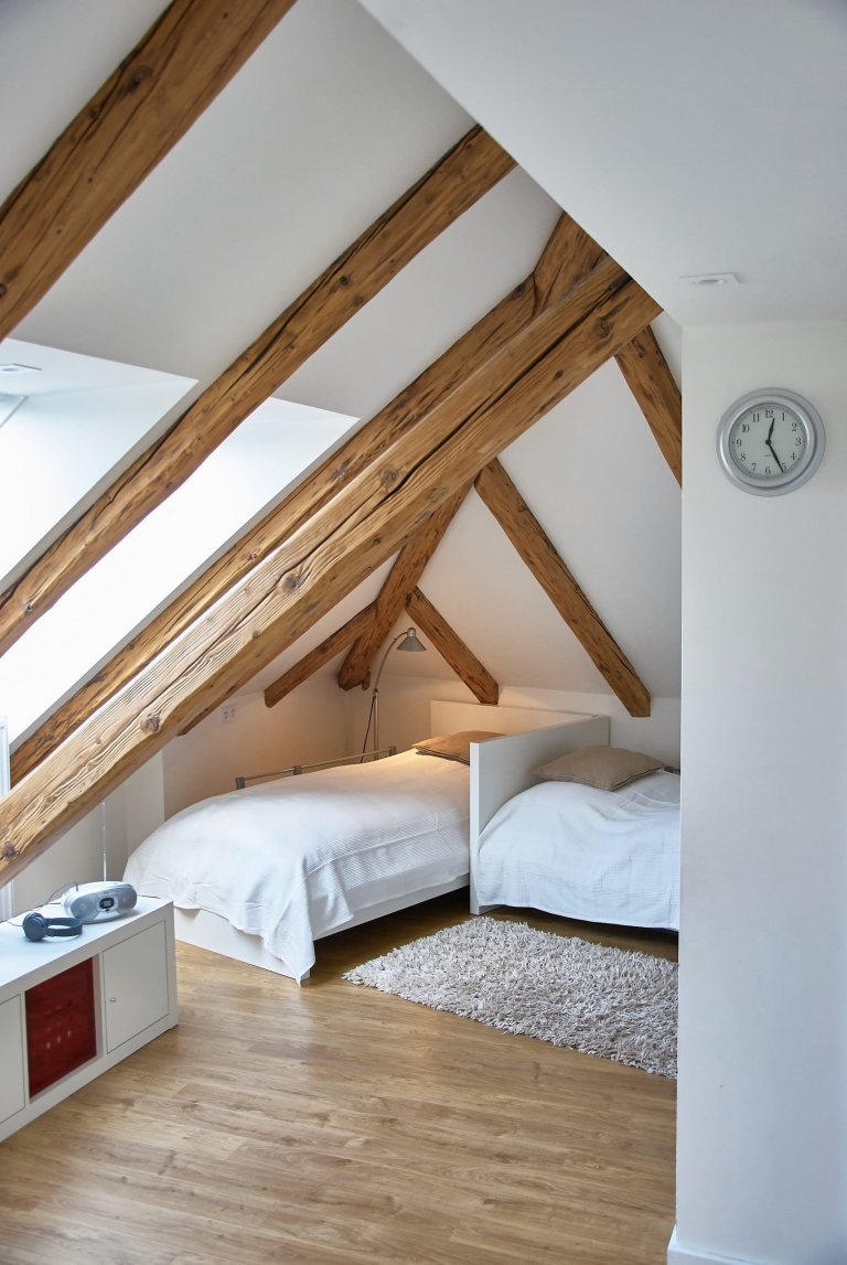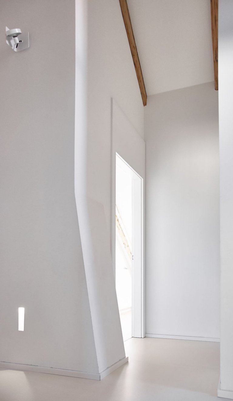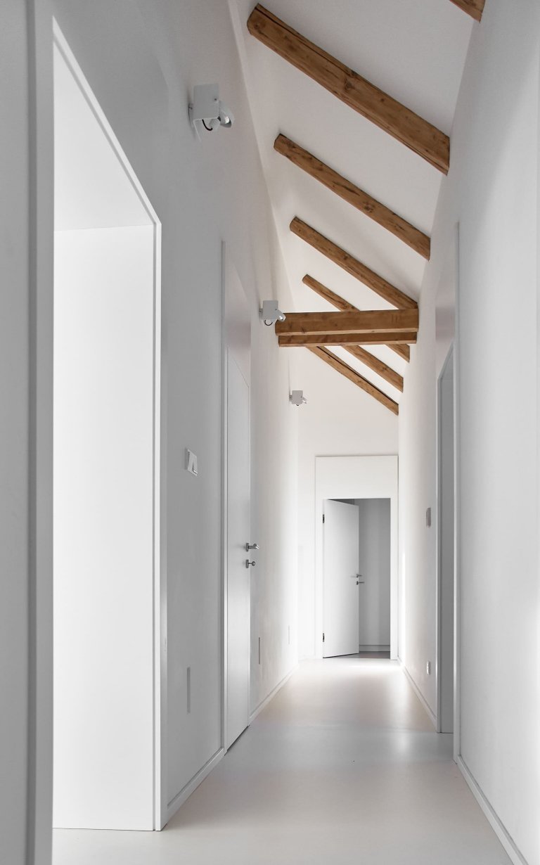 Otevření prostorů na plnou výšku krovu a dostatek světla dodalo bytu vzdušnost a pocitově eliminuje zmenšení objemu šikminami. Přiznaný krov dává interiéru svébytný podkrovní charakter. Je jeho dominantou a jednotícím prvkem. Bílá barva stěn a bílá epoxidová podlaha v denní zóně záměrně podporuje dominanci krovu. Dřevěná podlaha v ložnicích přináší prostorem komornější charakter. V duchu přesvědčení, že barvu do prostoru přinese jeho uživatel, byla zvolena jednoduchá barevné schéma v kombinaci s přirozeným vzezřením použitých materiálů.
