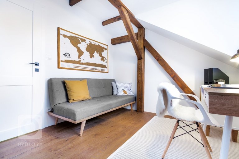 Půda stavení z 19. století tak prošla dokonalou proměnou, kterou ozvláštňují netradiční konstrukční řešení, příjemné kombinace barev i materiálů. Díky nutnosti šetřit s prostorem zde vzniklo bydlení plné fantazie a originality. Otevřel se tu svět nových možností stejně jako na stírací mapě v hostinském pokoji (pracovně)...