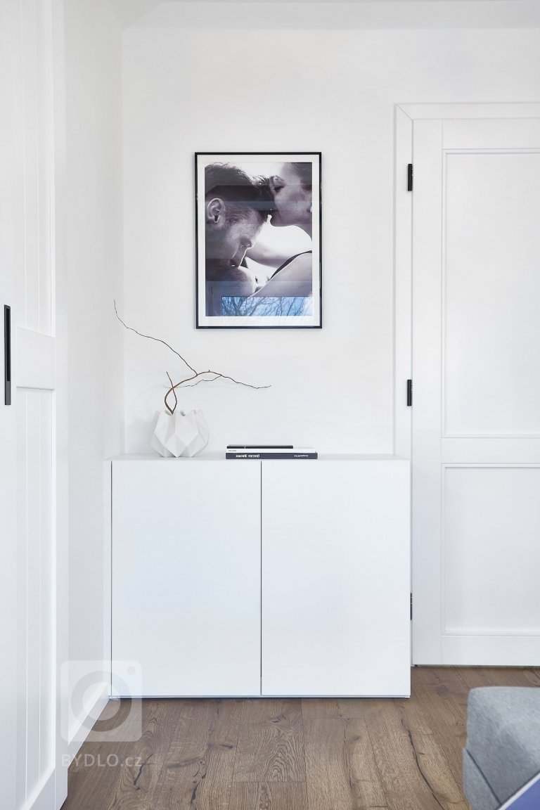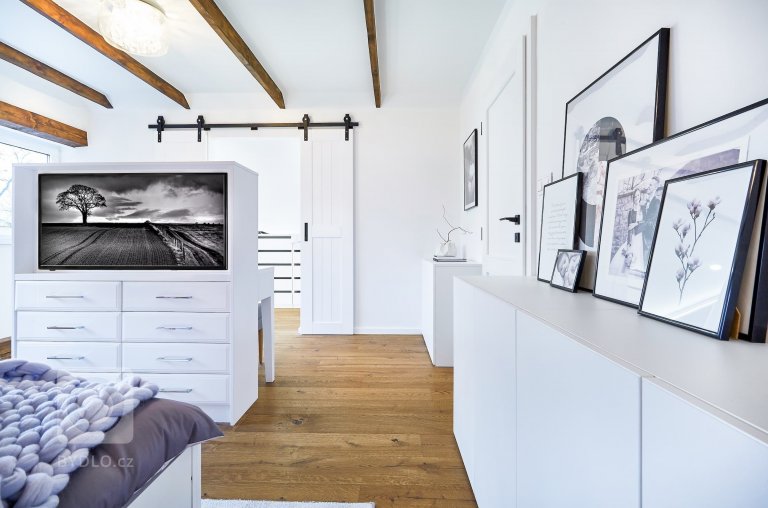 Pastelovým barvám fandí rovněž ložnice manželů propojená s šatnou. Úložným prostorům je zde vyčleněna celá jedna řada nízkých kabinetů podél stěny dveří. Na přání paní domácí zde vznikl i víceúčelový a velice elegantní make-up stolek, který z druhé strany ukrývá niku na televizi a několik úložných zásuvek na oblečení či drobné předměty. Zdejší dvoukřídlé posuvné dveře pak vedou přímo do šatny, kde se ve vzdušném a podsvíceném prostoru nachází veškeré oděvy.