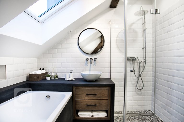 V industriálně-rustikálních tónech je vyvedena koupelna i toaleta. Z důvodu úspory prostoru navazuje vana přímo na umývací část, disponující dřevěnou úložnou skříňkou. K optickému zvětšení prostoru pak došlo díky mozaikové kombinaci dekorů na podlaze spolu s bílými psaníčky na zdi.