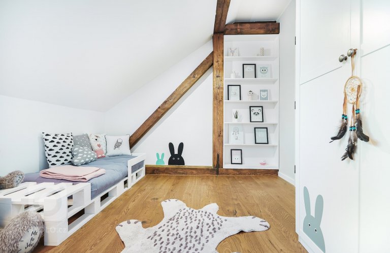 Perlou mezi pokoji je ten určený pro malou holčičku. Má dobrodružného ducha i něžnou atmosféru. Kombinace světle šedé, mentolově zelené a pastelově růžové barvy na bílém podkladě působí velmi půvabným dojmem. Přestože se jedná o dětský pokoj, z minimalismu se tu neslevilo. Najdete tu tedy jen nejdůležitější funkční nábytek – paletovou dřevěnou postýlku, šatní skříň a dětskou minilavici, kterou lze vmžiku proměnit na jídelní nebo kreslicí stoleček. Dětské království dotvářejí také dekorace v nice trámové konstrukce a nezbytné plyšové hračky. A protože se jedná o dcerku vášnivých cestovatelů, nemůže tu chybět ani útulné indiánské týpí.