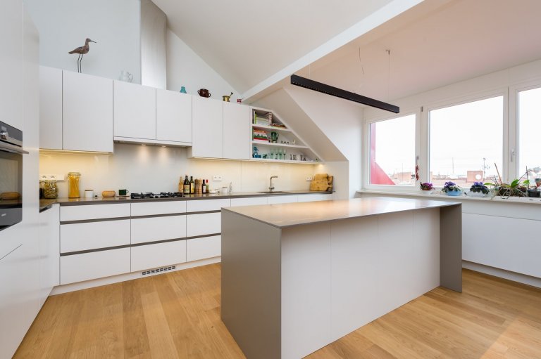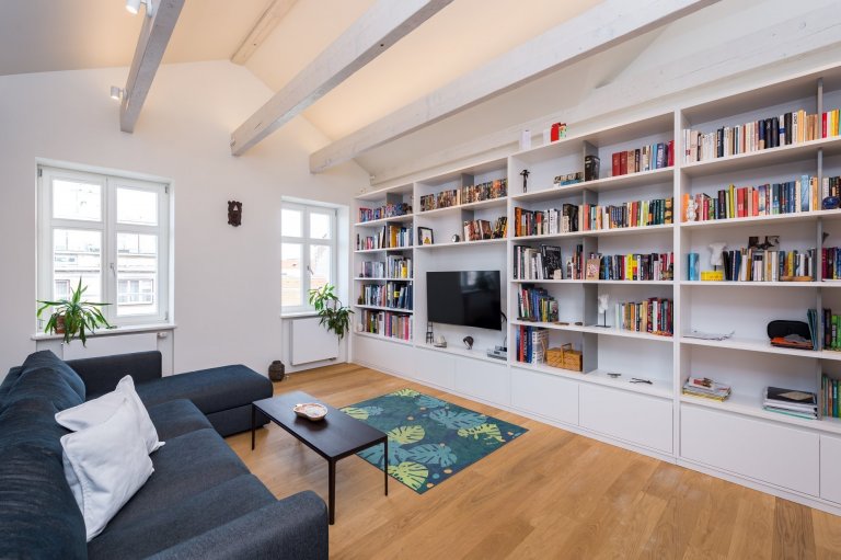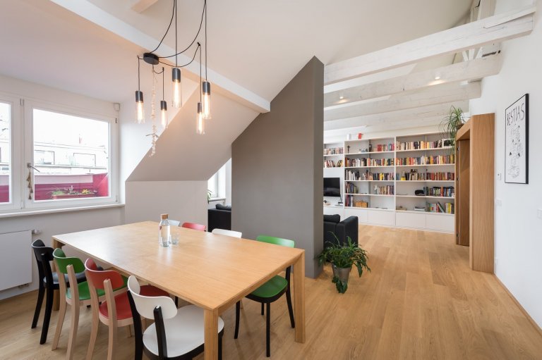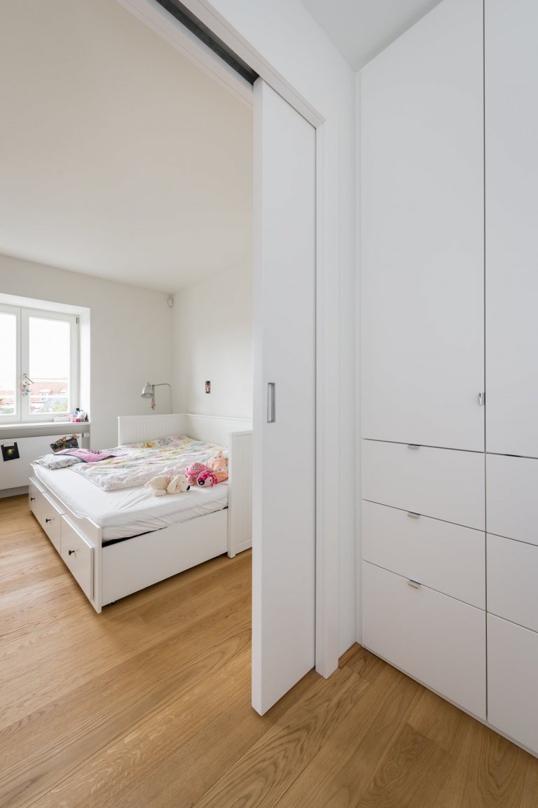 Pod taktovkou profesionálů ze studia Baukumst Architekti měl v tomto půdním bytě vzniknout velký obytný prostor s kuchyní, obývacím pokojem, dvěma dětskými pokoji a samostatnou ložnicí pro jejich rodiče. Zásadním požadavkem majitelů bytu přitom bylo maximálně využít prostor v podkroví pro vestavěné skříně a další úložiště. Všechny požadavky majitelů byly splněny na jedničku, a tak se rodiče se dvěma dětmi a psím mazlíčkem mohli zabydlet v natolik prostorném interiéru plném světla a teplých odstínů barev.