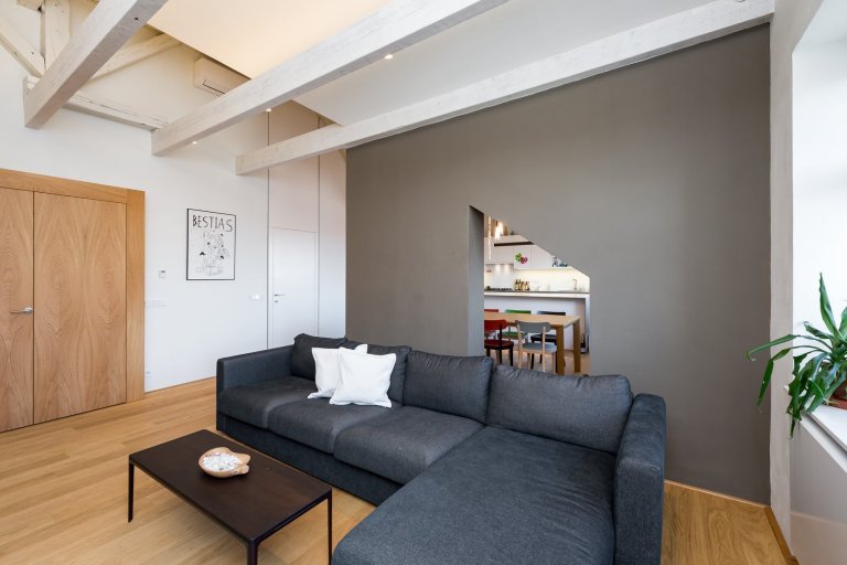 Tento prostorný podkrovní byt je směsicí praktičnosti, estetiky i fantazie. Nabízí místo pro setkávání s druhými i pro ztišení o samotě. Uprostřed příjemných barev a materiálů je zkrátka dokonalým domovem pro každého, kdo miluje prostor, světlo a styl.