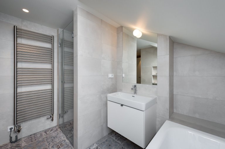 Perlou tohoto prostorného podkrovního bytu je desetimetrová terasa orientovaná do vnitrobloku, na kterou se dá vyjít třeba z kuchyně. Přímo propojená je však s ložnicí rodičů, přičemž si každý prostor zachovává svou svébytnou atmosféru. Není se čemu divit, že právě terasa je jedním z nejoblíbenějších míst rodiny. Proniká z ní dostatek denního světla, slouží k odpočinku i rozjímání.