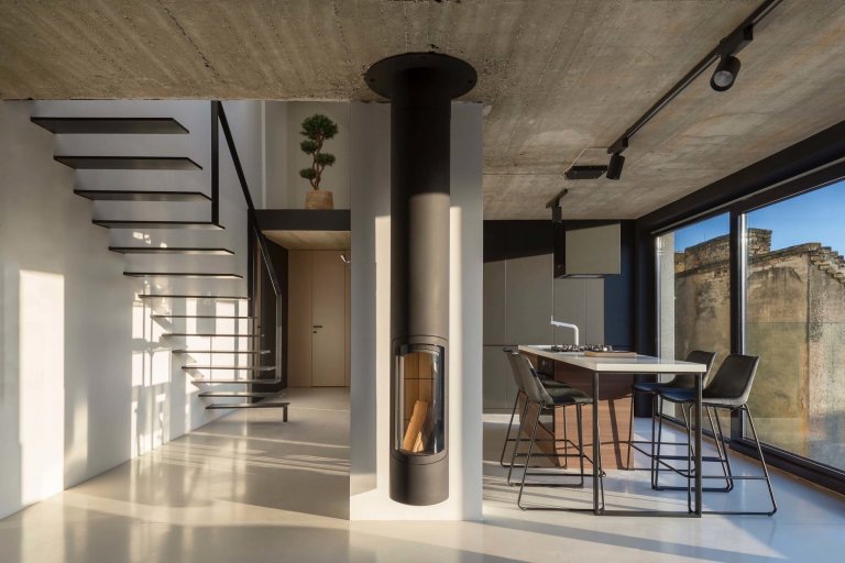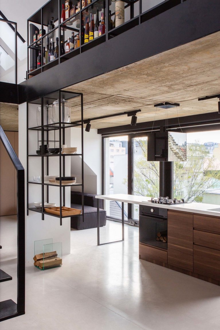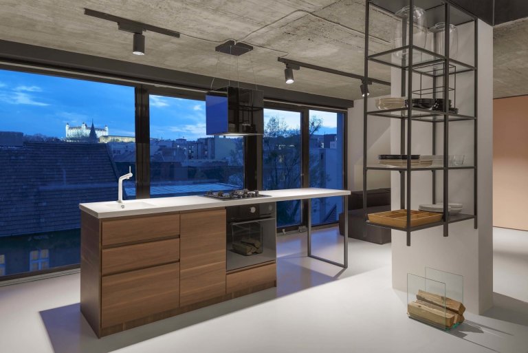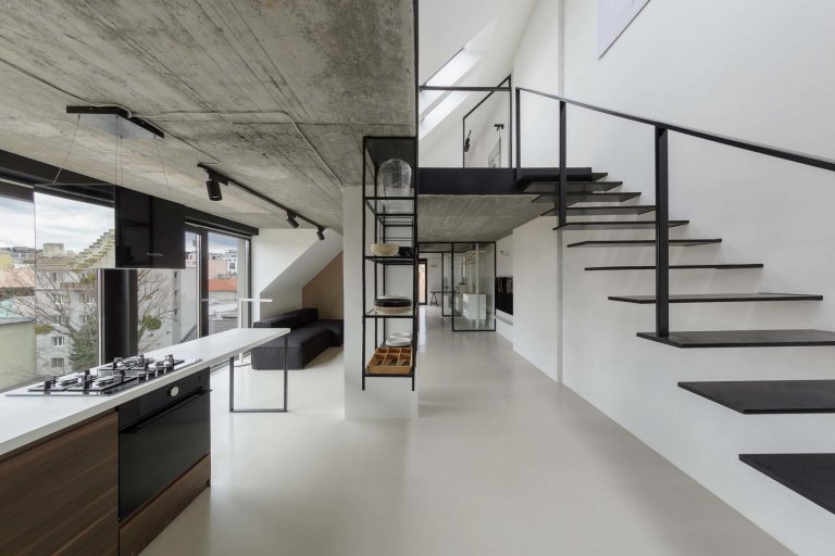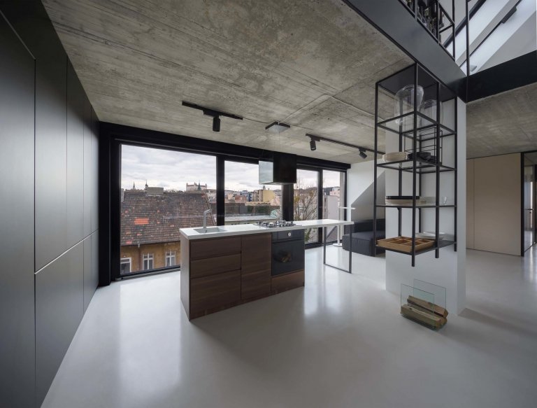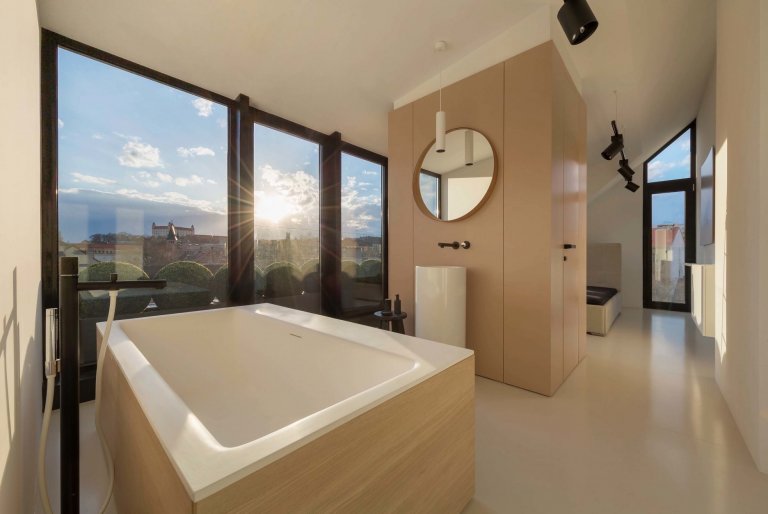 Moderní a osobitý interiér ukrývá byt v nadstavbě prvorepublikového domu v srdci Slovenska. Nejenže disponuje přitažlivě zařízenými prostorami, ale nabízí i nádherný výhled na Bratislavský hrad. Tohoto výhledu a praktické polohy v centru využil architekt Martin Fleischmann, pod jehož taktovkou vznikl na střeše historického domu působivý mezonet.