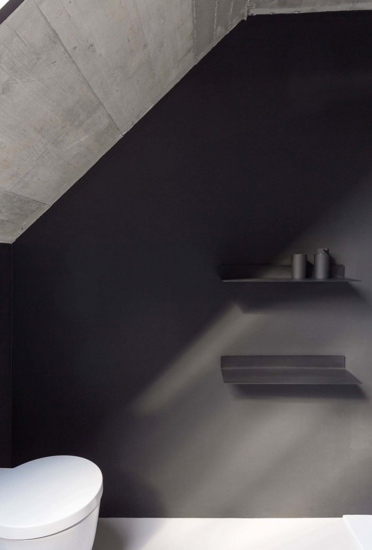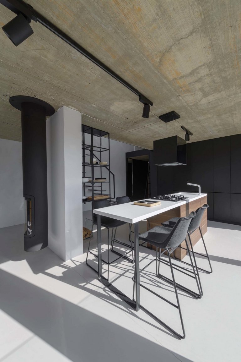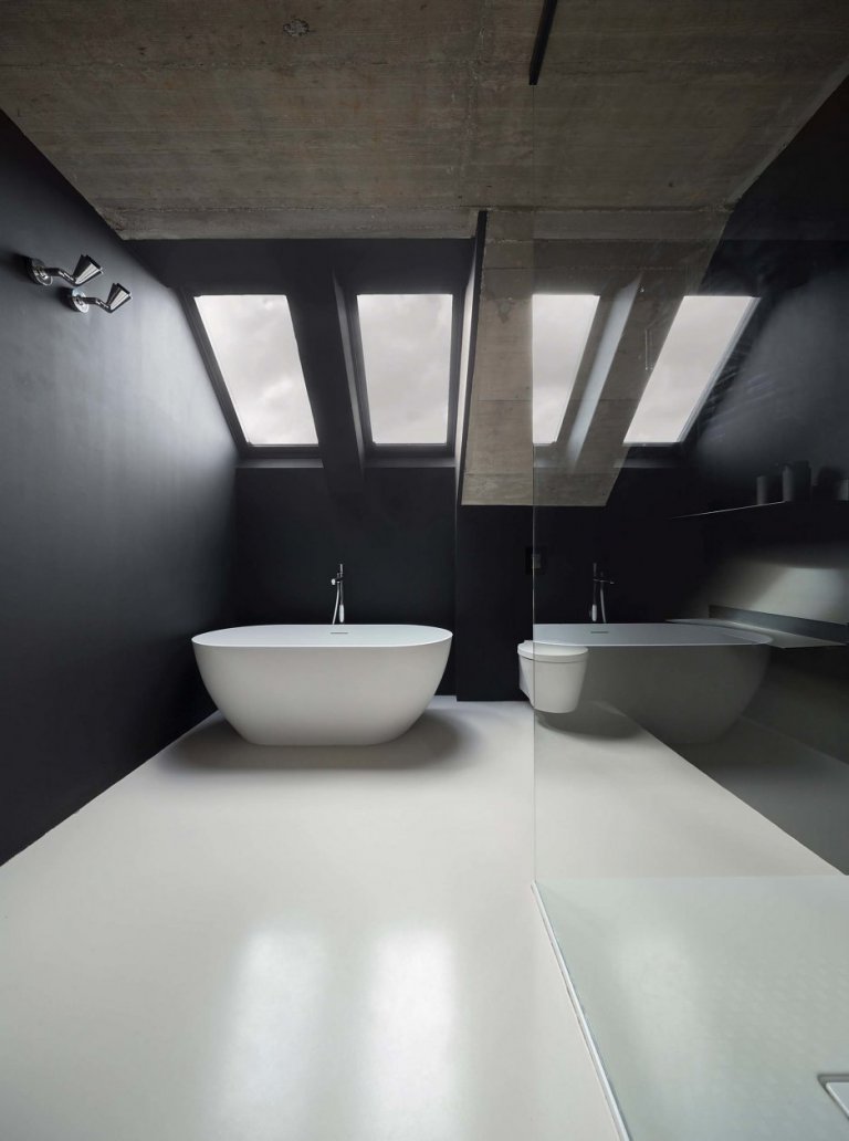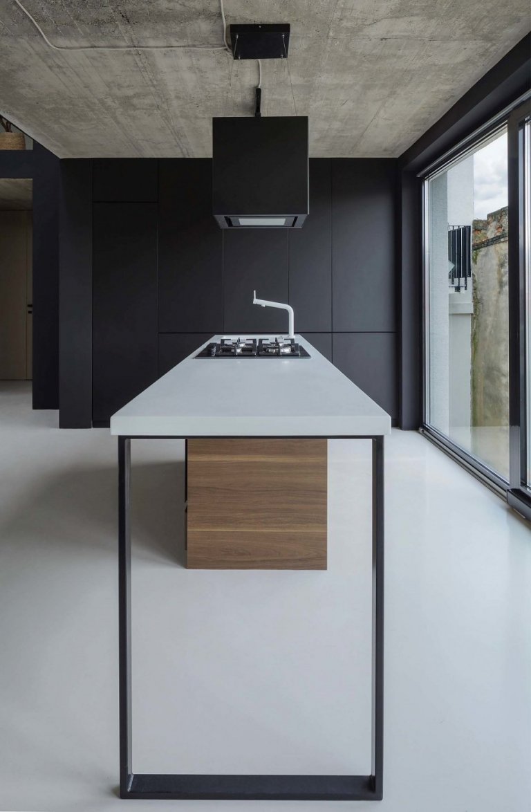 Interiéru podkrovního bytu vévodí bílá, šedá a černá barva. Ty pak zjemňují dřevěné prvky a obklady stěn. Právě akcenty černé barvy jsou v celém bytě silným tématem. O tom je možné se přesvědčit například při pohledu na svítidla, vypínače nebo na míru vyrobené ocelové prvky. Akcenty černé barvy doplněné o bílou a šedou si tento byt může dovolit především z toho důvodu, že do něj díky velkým oknům proniká dostatek světla. Interiér tak nepůsobí pochmurným, ale naopak svěžím dojmem.