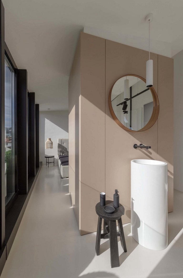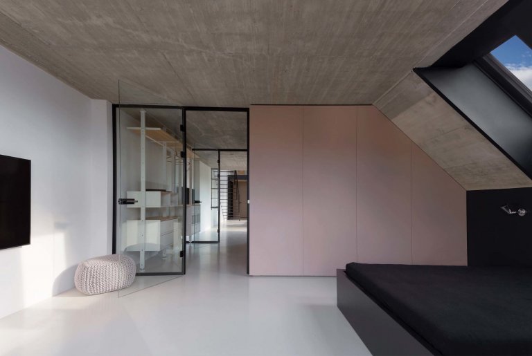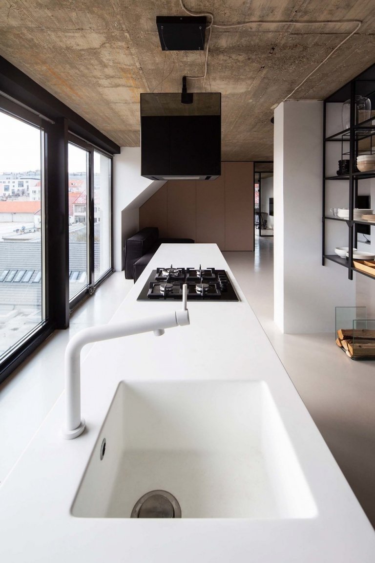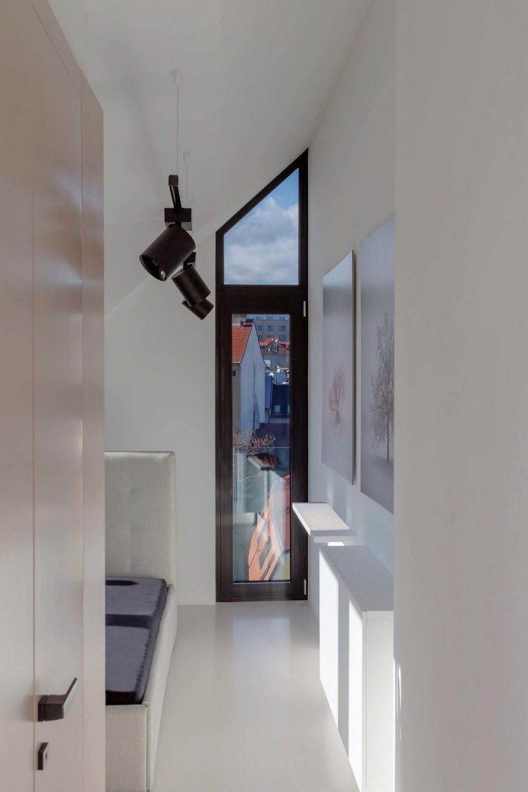Charakteristickými rysy tohoto podkrovního bytu je transparentnost a minimalismus. Interiér je naprosto otevřeným celkem, čemuž napomáhají i velkoplošná okna otevírající se do okolní městské krajiny. Prostor si nepotrpí na výrazné bariéry, a tak plyne volně v horizontálním i vertikálním směru. Optické hranice jsou tedy mezi jednotlivými funkčními částmi, ale také mezi interiérem a exteriérem naprosto minimalizovány. V minimalistickém duchu je voleno také vybavení interiéru a především volba bytových doplňků. Na rozdíl od výzdoby zde totiž vede funkčnost. Díky minimu zařízení tak mohou o to více vyniknout jednotlivé kusy nábytku a jejich provedení.
