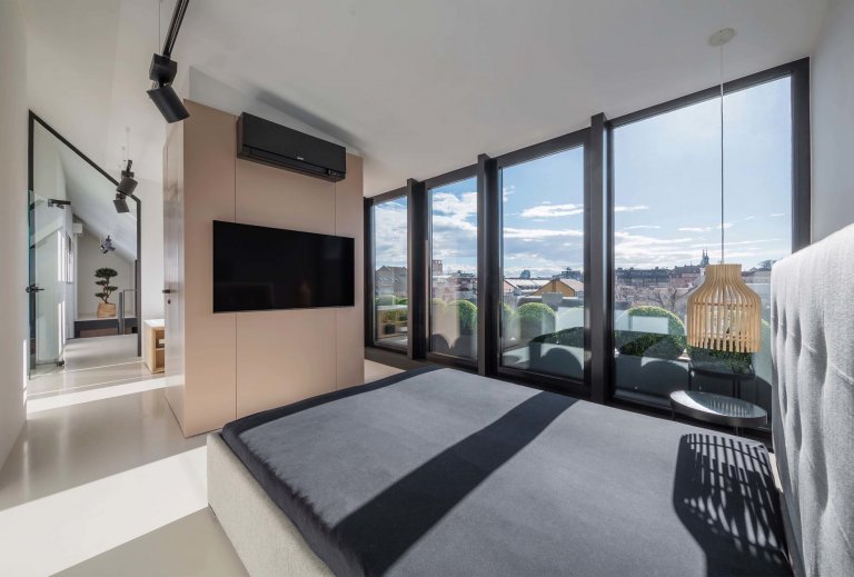 Interiér podkrovního bytu zaujímá plochu 125 m2, k níž ještě přiléhá plocha balkónu. Nadstavba je s ohledem na své historické prostředí velice citlivá a pomáhá jí i fakt, že se stala součástí vnitřního dvorního křídla. Nenarušuje tedy charakter ulice, jejíž architektonický výraz se začal formovat zhruba před sto lety. O to více kontrastní je nadčasový styl interiéru, který kráčí s moderní dobou a technickými výdobytky.