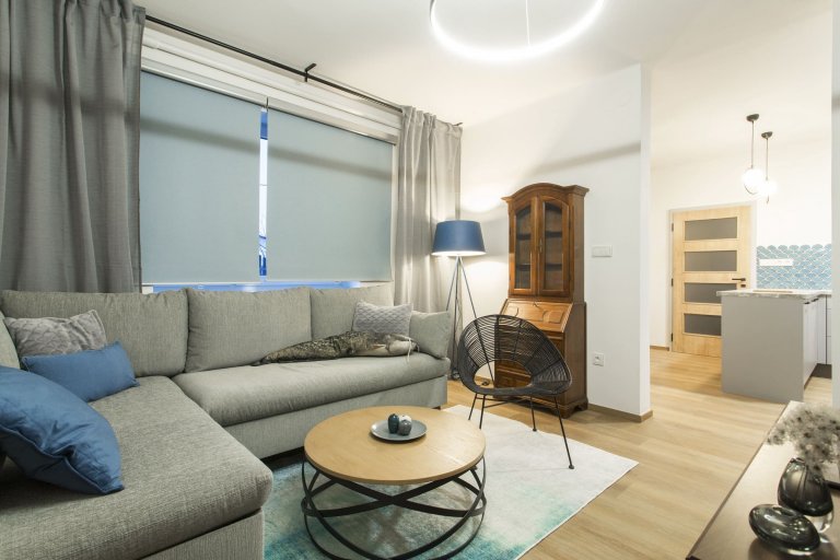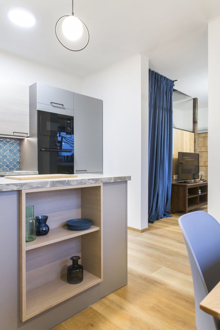 Proměna nebyla stavebně náročná. Sestávala výhradně z rozšíření otvoru mezi kuchyní a obývacím pokojem. Bylo také třeba vše připravit pro umístění kuchyňské linky, s čímž souvisely i elektrikářské a instalatérské práce. Stav původního bydlení nebyl problematický, a tak celková proměna mohla proběhnout naprosto poklidně. Bylo však zapotřebí vyrovnat různé výškové úrovně podlah v obou místnostech a začistit zvětšený otvor mezi kuchyní a obývacím pokojem.