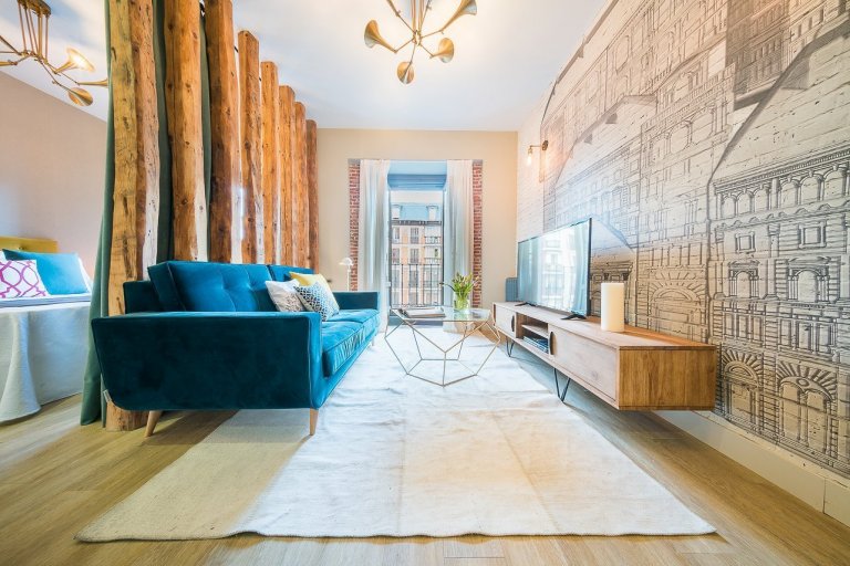 Optického zvětšení prostoru a pocitu vzdušného bytu je zde dosáhnuto díky jednotné, světlé, dřevěné podlaze spolu s dominantní bílou barvou zdí. Dřevěné trámy, které kromě dekorační funkce plní také funkci dělící, dodávají skutečně neotřelý vzhled. Pro pocit většího soukromí je spací prostor oddělen navíc závěsem. Kromě bílé a béžové, které vládnou prostoru, se bytem prolíná i barva petrolejová a zlatá.