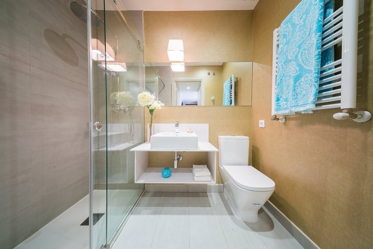Dostatek úložného prostoru v bytě zajišťuje vestavěná skříň umístěná v ložnici a maximum světla zase velká okna spolu s dveřmi na balkon. V celém bytě je díky veškerému sofistikovanému vybavení jedinečná atmosféra, která bude vyhovovat jak jednotlivci, tak páru.