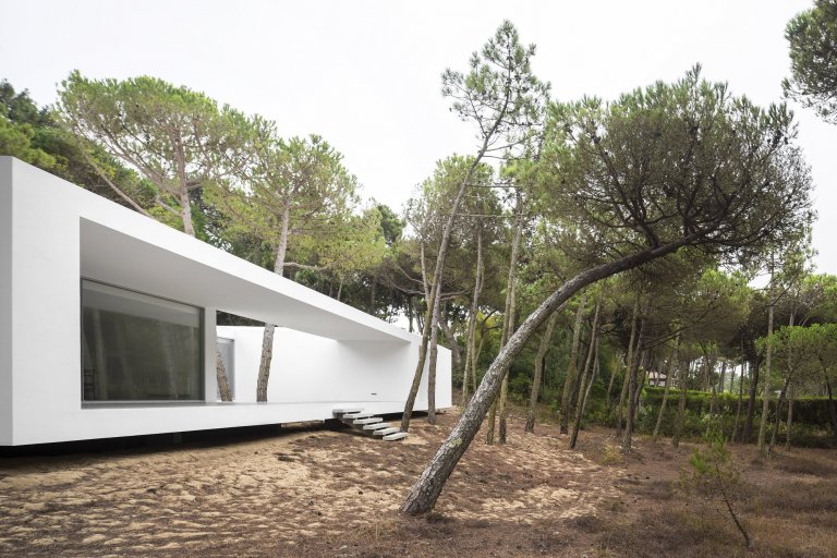 Bílý prázdninový dům zaujme nejen svým atypickým vzhledem, ale také způsobem, jakým přirozeně vrůstá do krajiny. Jeho atriem se proplétají štíhlé kmeny borovic, čímž vzniká naprosto úchvatná podívaná. Jednou tak tento dům obroste docela. Stromy navíc domu poskytují tolik důležitý stín, ale jen do takové míry, která je zapotřebí. Interiér je navíc plný velkých prosklených ploch, kterými dovnitř proudí dostatek přirozeného světla i krásných výhledů.