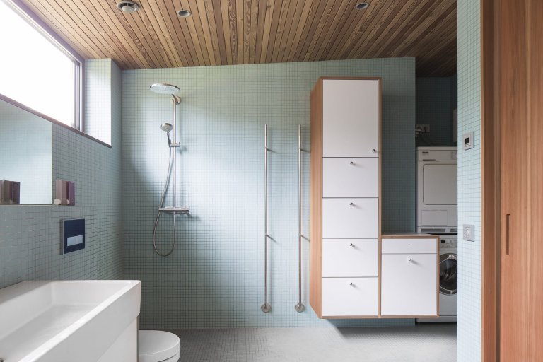 Přízemní dům uprostřed vzrostlých borovic vsadil na prosklené stěny a skandinávský styl s trochou retra. Velké otevřené prostory lákají k trávení volných chvilek v prostorném obývacím pokoji i s babičkou, která má na pozemku vlastní domeček.