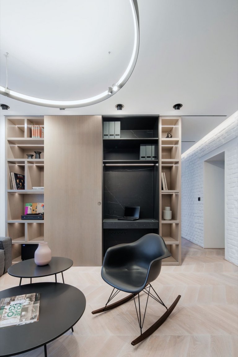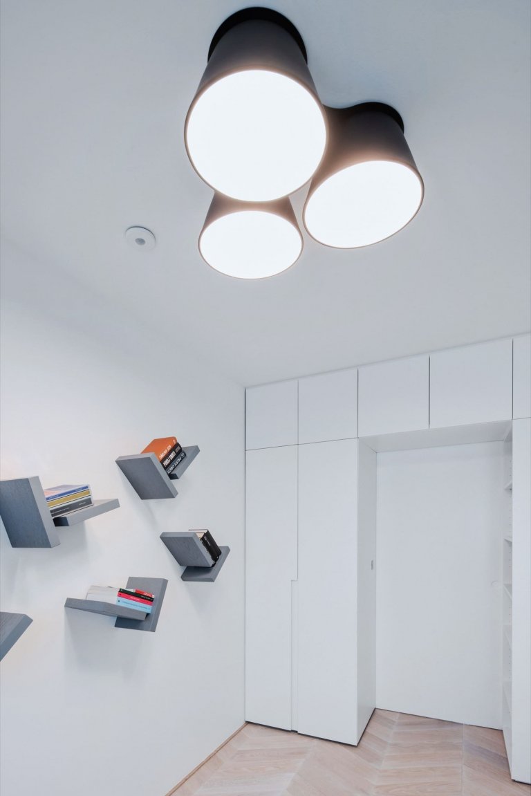 Hlavní devizou zrekonstruovaného bytu je jeho vzdušnost, prostorová otevřenost, důraz na detail a inteligentní systémy. O vzdušnost celého interiéru se přitom starají zejména chytře integrované úložné prostory, které barevně i materiálově splývají se svým okolím a nenarušují tak čistý a minimalistický styl bydlení. Chytré prvky se objevují napříč jednotlivými místnostmi, přičemž šetří prostor, energii a čas obyvatel bytu. V předsíni se tak nachází velká skříň, v níž jsou důmyslně nainstalované věšáčky. Tuto předsíňovou skříň lze zavřít posuvnými zrcadlovými dveřmi, čímž se opticky zvětší celý prostor předsíně. Důraz na detail a chytrá řešení je kladen rovněž v koupelně s velkým zrcadlem podsvíceným LED svítidly a doplněným o systém anti-páry. Díky inteligentnímu systému se zde podobně jako v dalších místnostech automaticky rozehraje hudba. Zajímavě řešená je také knihovna v obývacím pokoji, jež za posuvnými dveřmi ukrývá pracovní místo. Tyto dveře mohou také uzavřít vstup do dětského pokoje a ložnice. Důmyslnou vychytávkou jsou rovněž šuplíky s elektrickým výsunem mimo jiné zakomponované v kuchyňské lince. O jistou dávku originality není ochuzen ani dětský pokoj skrytý za dveřmi s tabulovou barvou a zkrášlený například skříní se třemi podsvícenými otvory na hračky.