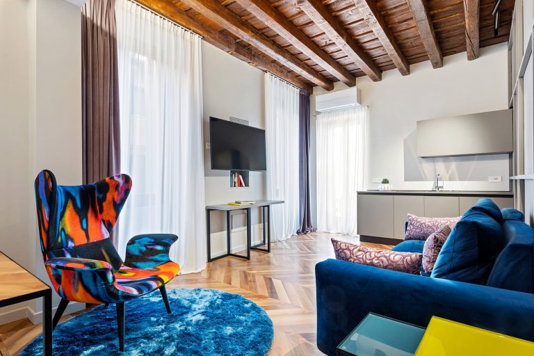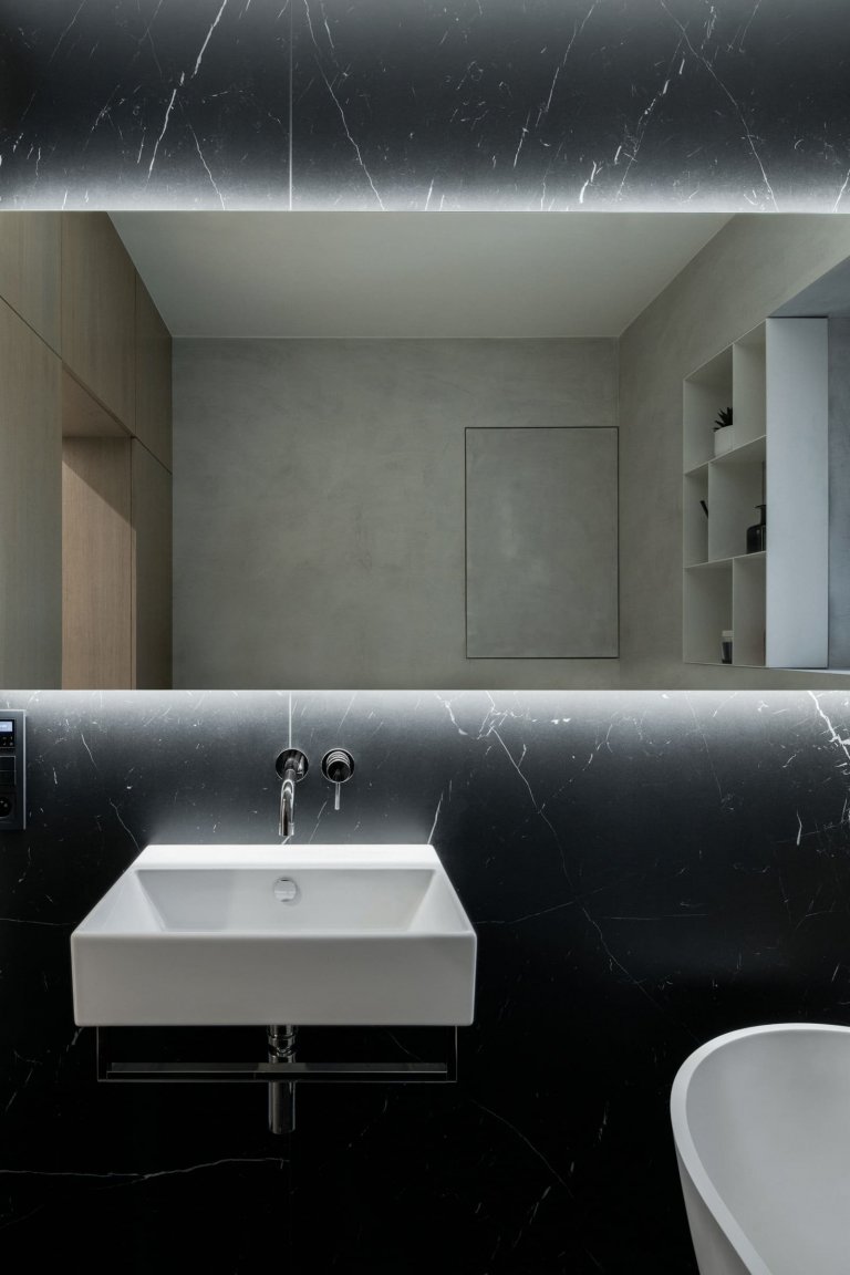 Celému interiéru bytu vévodí šedé a modré dýhy. Velkou roli zde hraje černý velkoformátový obklad, který v koupelně doplňují betonové stěrky. Velkoformátový obklad našel využití rovněž na nábytku v obývacím pokoji. O hru stínů v interiéru a zachování genia loci se v obývací zóně postarala přiznaná cihlová stěna natřená na bílo. Velký obdiv si pak mimo jiné zaslouží dřevěná podlaha v ložnici, která přechází až na zeď a na dveře, a to bez narušení plynulosti vzoru. Za pozornost stojí také integrovaná plechová nika v ložnici, nad kterou se spouští dvě umělá svítidla.
