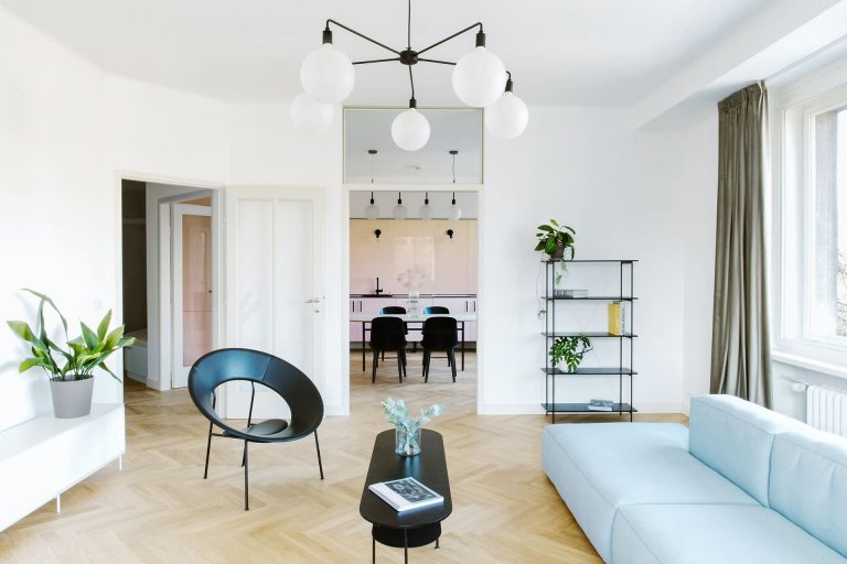 Byt, který už nutně potřeboval kompletní rekonstrukci, vznikl už dříve spojením dvou bytových jednotek, jejichž původ sahá do první poloviny 20. století. Nový majitel se tak musel popasovat jak s úpravou dispozic pro čtyřčlennou rodinu, tak s řešením stavebně technického stavu bytu, o který se předchozí majitel příliš nestaral. V obou případech mu naštěstí přišel plně vstříc tým odborníků, pro něž se rekonstrukce bytu doslova od podlahy stala opravdovou výzvou. Po jejich zásahu tak z původního bytu zůstaly zachovány pouze obvodové stěny a obě stropní konstrukce. Stěžejním bodem návrhu se stala eliminace původního řešení, kdy všechny místnosti bytu byly průchozí. Došlo tedy ke zrušení jednoho ze dvou vstupů do bytu, probourání nepotřebných komínových průduchů a zbourání všech příček. Zrekonstruovanému bytu tak ve výsledku na prostoru neubírají žádné zbytečné chodby.