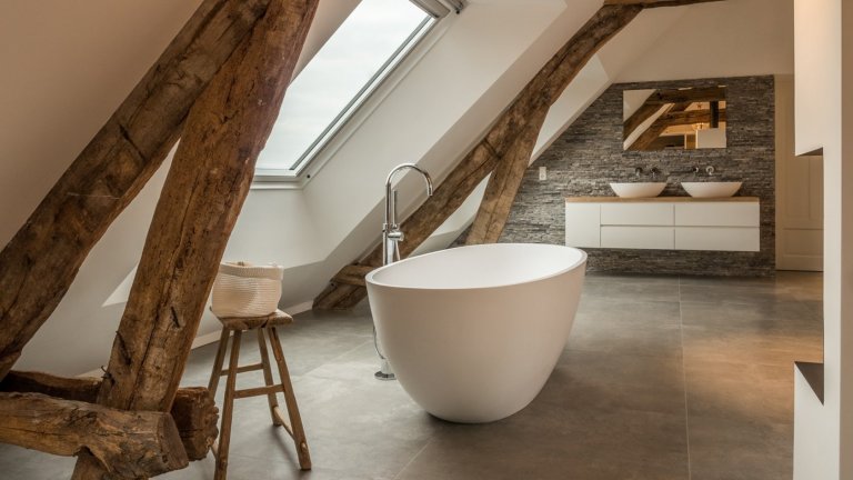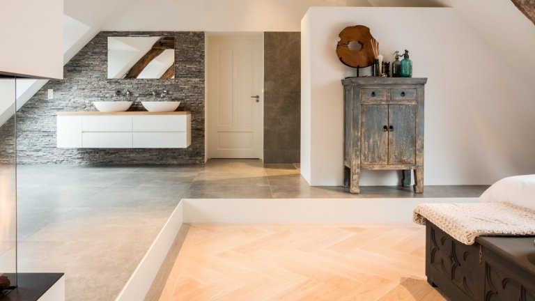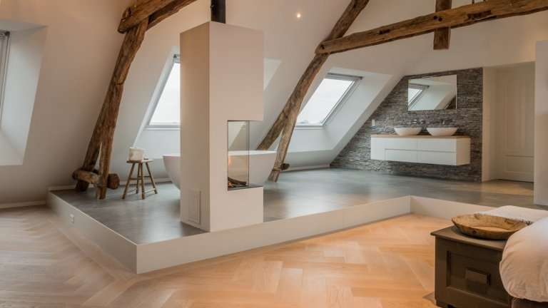Jak již bylo řečeno výše, rekonstruovat starý dům, respektive zemědělské stavení, je mnohdynáročnější než postavit nový dům od základů. Když ale majitelé přesto chtějí zachovat atmosféru místa, musí počítat s tím, že renovační práce budou vcelku rozsáhlé. V případě této holandské stodoly musela být vyměněna celá střecha z pálených tašek, byly zatepleny vnější stěny budovy a položeny nové podlahy a rozvody elektřiny, plynu, vodovodu a kanalizace. Jestliže došlo ke stržení některých stěn, jiné byly naopak opraveny a vyčištěny (například cihlová stěna v jídelním koutě) a některé byly dostavěny. Po přistavění stropu nad celistvým blokem s kuchyní a knihovnou vzniklo nové obyvatelné podkroví, které představuje jedna velká místnost sestávající se z koupelny, šatny a ložnice. Ani zde tedy nedošlo ke členění na jednotlivé místnosti. Koupelna je tvořena vyvýšeným dlaždicemi pokrytým povrchem, kterému dominuje samostatně stojící vana a kamna, z jejichž tepla se lze kochat přímo z pohodlí vany. Šatnu zahrnují otevřené šatní skříně s policemi, šuplíky a věšáky. Jediné, co je v patře oddělené, je toaleta a sprchový kout. Koupelna plynule přechází v ložnici, kde patinovaná skříňka kontrastuje s čistými liniemi zbývajícího vybavení. Ze slov majitelů domu je patrné, že rekonstrukce se vyplatila a oni nyní žijí v jejich snovém bydlení a každý den si užívají luxusu, prostoru a světla, které jim poskytuje.