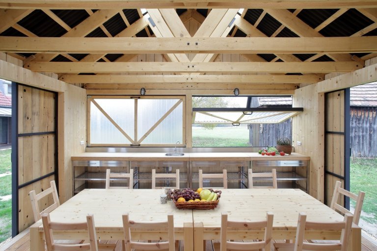 Součástí rekonstrukce bylo i odstranění jedné z menších dřevěných staveb a nahrazením novou stavbou, která však připomíná původní objekt. Aby se dosáhlo stejného vzhledu jako u stodoly, bylo dřevo napuštěno tmavým olejem. Přízemí tohoto objektu slouží jako letní kuchyně s jídelnou, kde se může rodina setkávat za hezkého letního počasí se svými přáteli.