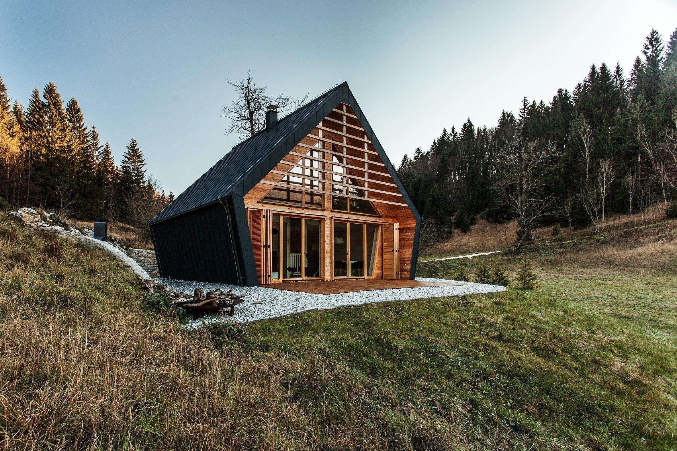 Patrový dům evokující svou velikostí spíše větší chatu je situován v překrásné krajině Slovinska, které dává patřičně vyniknout díky užití skla ve velkých plochách přední části domu. Stavba je rozdělena na čtyři stejně velké úseky – místnosti, které jsou uskupeny tak, aby jejich součástí byla právě prosklená část domu, což dodává každé z těchto místností další rozměr daný výhledem do kraje a opticky to zvětšuje prostor a naplňuje ho světlem. Zajímavostí také je, že stavba není na bocích opatřena žádnými okny, veškeré světlo tedy vychází právě z přední prosvětlené části domu. Domek stojící na kraji lesa respektuje životní prostředí a zapadá do okolní krajiny, aniž by ji narušoval – to bylo také jedním z cílů projektu.