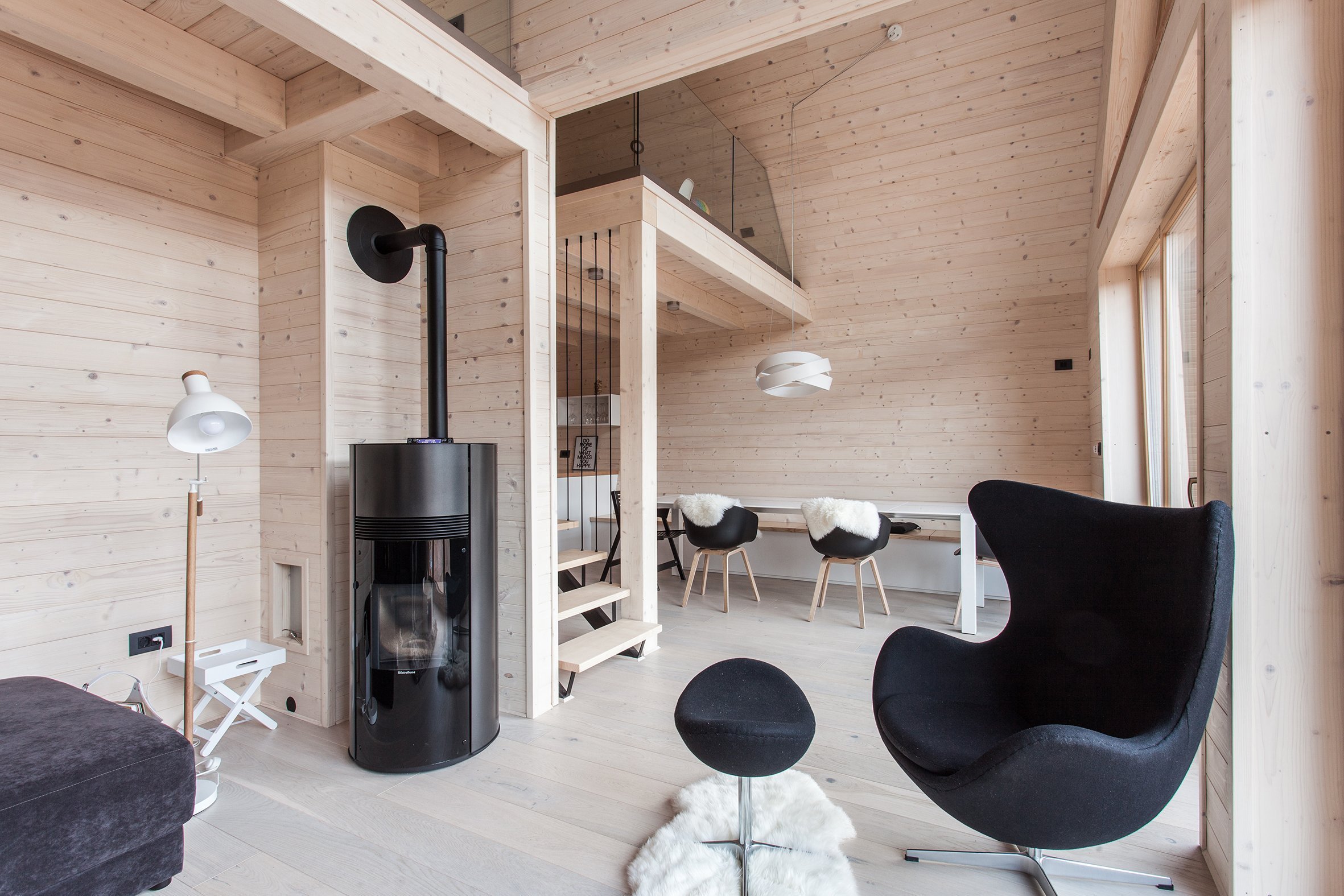 Stavba nedisponuje přemírou místností, najdeme tu však ty základní, navíc komfortně vybavené, což je zcela dostačující. V přízemí se nachází obývací pokoj, kuchyně, jídelna a koupelna se saunou. První patro zabírá ložnice s výhledem na spodní patro. Budova umožňuje jak stálé bydlení pro jednoho či dva obyvatele, tak může být využívána pouze jako víkendový příbytek pro rodiny s dětmi či bez dětí. Dřevostavba získala v roce 2016 první místo v soutěži o nejlepší dřevostavbu Slovinska.