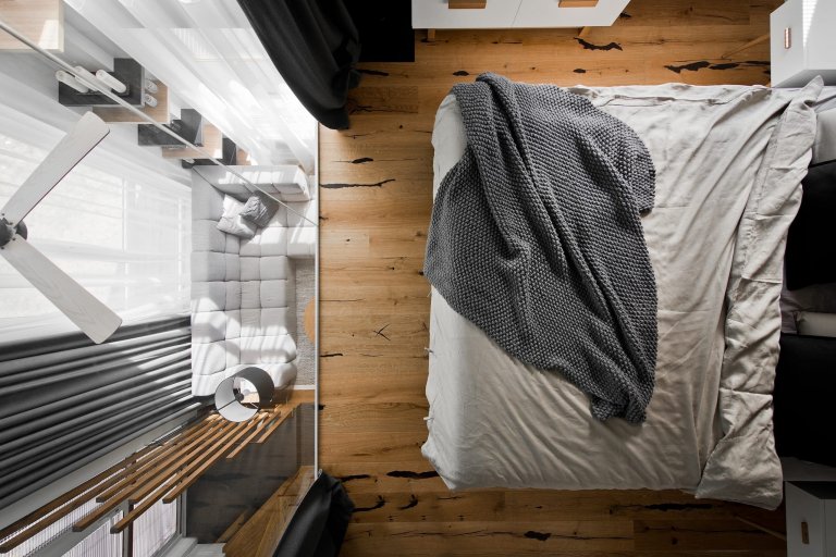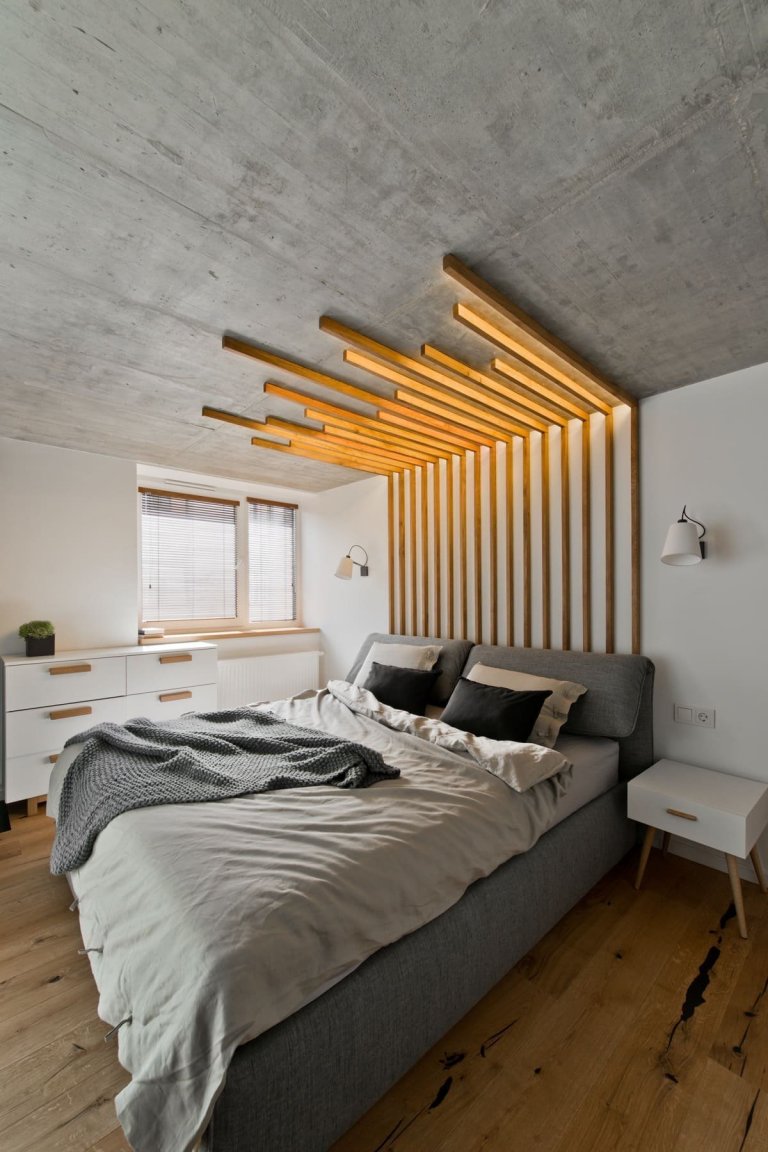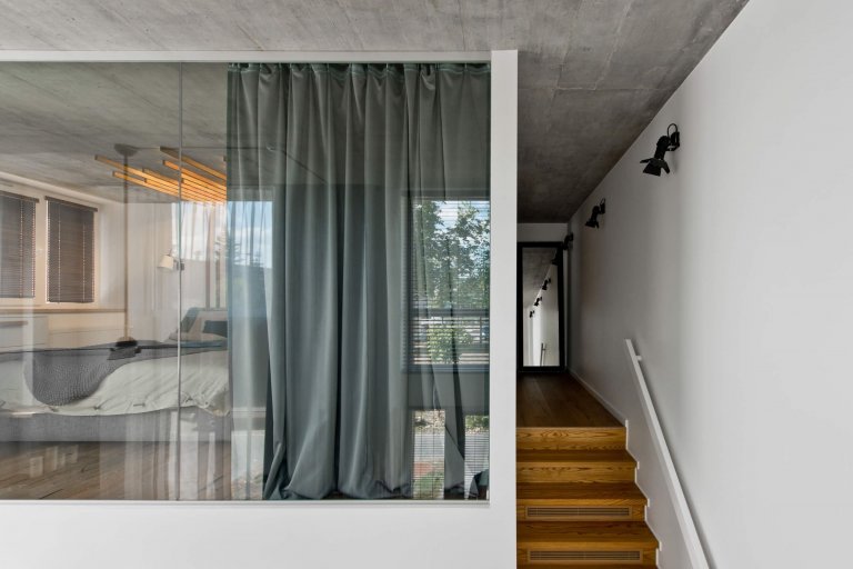 Velká míra kreativity nechybí ani v ložnici, která je o to minimalističtěji zařízená. Její dominantou jsou totiž subtilní dřevěné laťky připevněné za čelo postele, které jako paprsky dosahují až na strop. Laťky v sobě mají zabudované LED pásky, takže zároveň fungují jako originální osvětlení. Strop je z betonu, přesto ale nenarušuje útulnou atmosféru v interiéru ložnice, v němž převládají nenápadné barvy a čisté linie. Ložnice je přitom od zbylého prostoru poněkud netradičně oddělena stěnami z čirého skla, které tlumí hluk doléhající z obývacího pokoje.