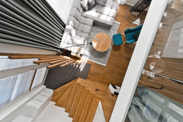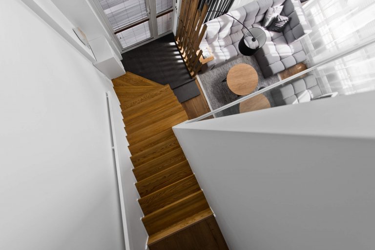 Moderně zařízený loftový byt se stal domovem mladého páru, který miluje kombinaci dřeva a teplých barev. Na první pohled v něm zaujmou horní kuchyňské skříňky připomínající svým seskupením tvar harmoniky. Zajímavým opakujícím se prvkem v interiéru jsou také subtilní dřevěné laťky doplněné o LED pásky, které jakoby představovaly světelné paprsky.