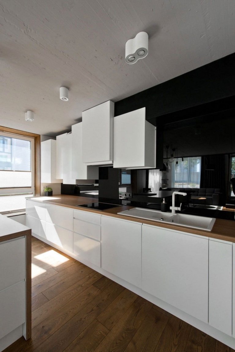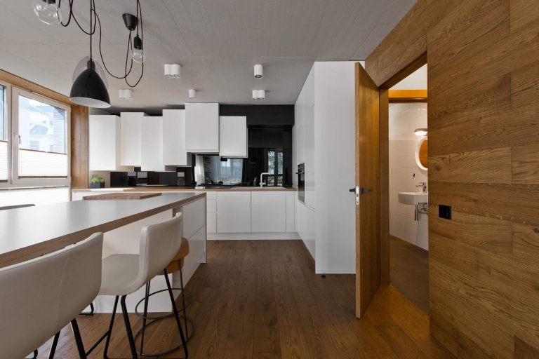 Kombinace bílé barvy a světlých tónů dřeva je v kuchyni doplněna o černou barvu v zádech kuchyňské linky. Černé sklo tak zajímavě kontrastuje s částí kuchyňské linky v bílé barvě. Kuchyně je řešená opět minimalisticky. Na první pohled však zaujmou sestupně navržené horní kuchyňské skříňky, které jakoby ve výsledku připomínaly tvar harmoniky. Doprovázejí je vysoké panelové skříně s integrovanými spotřebiči a velkorysým prostorem pro uložení potravin. Převahu využitého dřeva v kuchyni propojené s jídelnou a obývacím pokojem kompenzuje betonový strop s jednoduchými reflektorovými svítidly v černé a bílé barvě. Zóny s odlišnými funkcemi přitom nenásilně rozděluje elegantní kuchyňský ostrůvek v bílé barvě. Ten se využívá jako prostor určený k vaření, ale funguje také jako jídelní stůl.