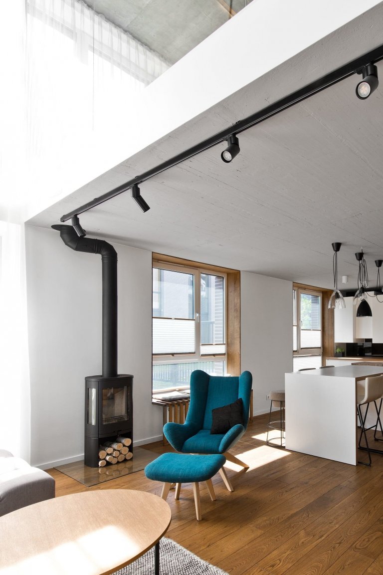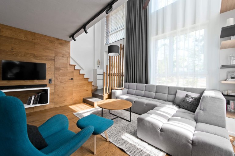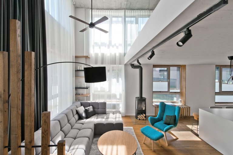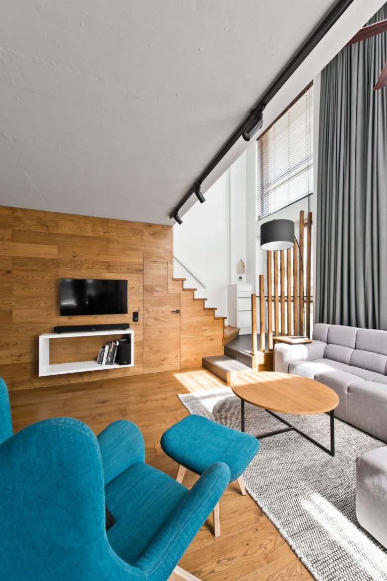 V interiéru loftového bytu nejde pouze o hru světla, která zde vytváří příjemnou atmosféru. Uzdu fantazie zde popustili i jeho obyvatelé, kteří vsadili na kombinaci dřeva, betonu a teplých barev. Vzhledem k tomu, že si oblíbili minimalistický styl, mohla jejich kreativita vyniknout v plné síle. Hlavní roli zde hraje dřevo v příjemně světlých tónech, které je položeno v celém polyfunkčním prostoru na podlaze a také na jedné ze stěn. Ta funguje rovněž jako poněkud netradiční obývací stěna doplněná o jednoduchou poličku a televizi. Ze dřeva jsou i další prvky v obývacím pokoji. Patří k nim například minimalistické poličky na zdi, konferenční stolek na subtilní kovové konstrukci či zajímavé dřevěné laťky, které se hlásí o slovo i v ložnici. Světlé dřevo si přitom skvěle rozumí s bílou, šedou a černou barvou, jež interiéru vévodí. V obývacím pokoji však tuto neutrální barevnou kombinaci zajímavě rozbíjí tyrkysové křeslo s podnožkou.