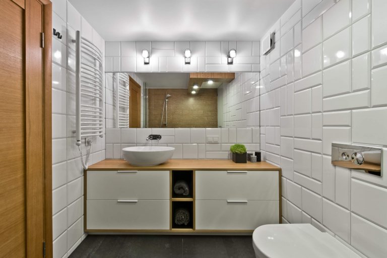 V koupelně o sobě dává čistě bílá barva vědět nejvíce. Hlavní a nadčasovou dekorací koupelny je totiž bílý obklad v zajímavém geometrickém uspořádání. Tento netradiční obklad příjemně kontrastuje s tmavou dlažbou. Co se týče vybavení koupelny, majitelé dali přednost sprchovému koutu walk-in. Pro ukládání nezbytností zvolili prostornou nábytkovou skříňku táhnoucí se přes celou šířku místnosti. Na skříňce našlo místo jednoduché umyvadlo. Nechybí tu ani nástěnná podomítková baterie. Kvůli úspoře prostoru pak majitelé zvolili toaletu s komprimovanými tvary.